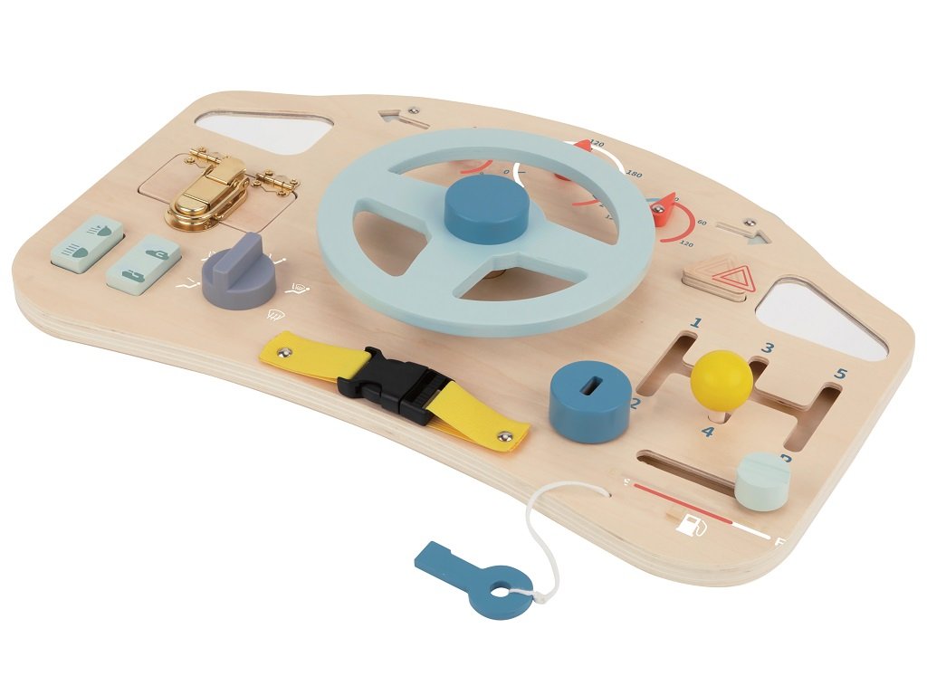 Mami, tati, dneska řídím já! Tato hrací deska přináší spoustu zábavy, díky které bude moci Vaše dítě rozvíjet svou zručnost, zvídavost a zejména jemnou motoriku. Zámky, pásky a tlačítka dávají dítěti možnost procvičovat různé posouvání, otáčení či otevírání a připravit se tak na každodenní úkony. Mimo aktivit zapojující smyslové dovednosti deska disponuje volantem - skvělá možnost jak posunout představivou hru ještě dál. Jízda to bude daleká! Hlavní vlastnosti: podporuje nezávislost, jemnou motoriku a koordinaci ruka-okopodněcuje kreativní myšlení a vývoj představivostisenzorická stimulaceedukace skrze hru Značka a certifikát FSC® (Forest Stewardship Council) zaručuje, že dřevo, ze kterého byl produkt vyroben, nebylo vytěženo nelegálně a pochází z lesů obhospodařovaných šetrným či přírodě blízkým způsobem, ve kterém jsou dodržovány přísné environmentální a sociální požadavky. Značka FSC® na výrobku znamená, že svým nákupem pomáháte chránit lesy a podporujete šetrné, odpovědné či přírodě blízké hospodaření, díky kterému jsou naše lesy stabilnější, zdravější, mají přirozenou druhovou skladbu a lépe odolávají negativním následkům klimatických změn.Doplňkové parametry