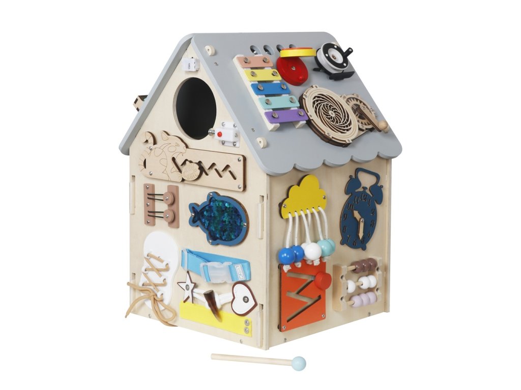Od tkaniček až po hrající telefon! Tento nádherný interaktivní domeček je inspirovaný principy Montessori a přináší dětem nekonečné možnosti objevování a učení se hrou. Každá jeho strana nabízí nové dobrodružství, které rozvíjí jemnou motoriku, trpělivost, zvídavost a schopnost řešit problémy. Děti zde najdou různé druhy zámků, západek a háčků, které po odemknutí odhalí tajemná dvířka, spinner k roztočení, otočnou minutku, funkční vypínač se světýlkem, či barevný labyrint s rybičkou. Xylofon s paličkou seznámí děti s prvními tóny a rytmem, zatímco hodiny naučí porozumět času. Nechybí ani hrajicí telefon jenž Vás zabaví nejrůznějšími zvuky i veselými melodiemi! Domeček uvnitř svítí. Motivuje děti k samostatnému objevování, učí je trpělivosti a koncentraci a zároveň je připravuje na každodenní činnosti běžného života prostřednictvím praktického tréninku. Poskytuje bezpečné a podnětné prostředí, ve kterém si děti hravou formou rozvíjejí dovednosti nezbytné pro samostatnost. Kombinace přírodního dřeva s příjemnými barvami spolu s kvalitním provedením dělají z této hračky pěkný doplněk každého pokojíčku nebo herny. Domeček se dodává složený v krabici. Hlavní vlastnosti: funkční světýlko a hrající telefondomeček uvnitř svítídodání ve složeném stavuvčetně paličky ke xylofonupodporuje samostatnost, jemnou motoriku a koordinaci ruka-okopodněcuje kreativní myšlení a rozvoj představivostisenzorická stimulaceedukace prostřednictvím hryinspirováno Montessoripřipravuje děti na každodenní činnosti běžného životana napájení souží LR44 knoflíková baterie a 4xAAA baterie (nejsou součástí balení)vhodné pro děti od 3 letDoplňkové parametry