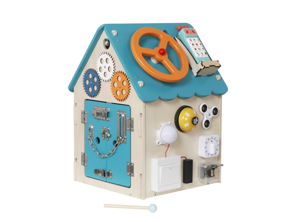 Od tkaniček až po hrající telefon! Tento nádherný interaktivní domeček je inspirovaný principy Montessori a přináší dětem nekonečné možnosti objevování a učení se hrou. Každá jeho strana nabízí nové dobrodružství, které rozvíjí jemnou motoriku, trpělivost, zvídavost a schopnost řešit problémy. Děti zde najdou různé druhy zámků, západek a háčků, které po odemknutí odhalí tajemná dvířka, spinner k roztočení, otočnou minutku, funkční vypínač se světýlkem, či barevný labyrint s rybičkou. Xylofon s paličkou seznámí děti s prvními tóny a rytmem, zatímco hodiny naučí porozumět času. Nechybí ani hrajicí telefon jenž Vás zabaví nejrůznějšími zvuky i veselými melodiemi! Domeček uvnitř svítí. Motivuje děti k samostatnému objevování, učí je trpělivosti a koncentraci a zároveň je připravuje na každodenní činnosti běžného života prostřednictvím praktického tréninku. Poskytuje bezpečné a podnětné prostředí, ve kterém si děti hravou formou rozvíjejí dovednosti nezbytné pro samostatnost. Kombinace přírodního dřeva s příjemnými barvami spolu s kvalitním provedením dělají z této hračky pěkný doplněk každého pokojíčku nebo herny. Domeček se dodává složený v krabici. Hlavní vlastnosti: funkční světýlko a hrající telefondomeček uvnitř svítídodání ve složeném stavuvčetně paličky ke xylofonupodporuje samostatnost, jemnou motoriku a koordinaci ruka-okopodněcuje kreativní myšlení a rozvoj představivostisenzorická stimulaceedukace prostřednictvím hryinspirováno Montessoripřipravuje děti na každodenní činnosti běžného životana napájení souží LR44 knoflíková baterie a 4xAAA baterie (nejsou součástí balení)vhodné pro děti od 3 letDoplňkové parametry