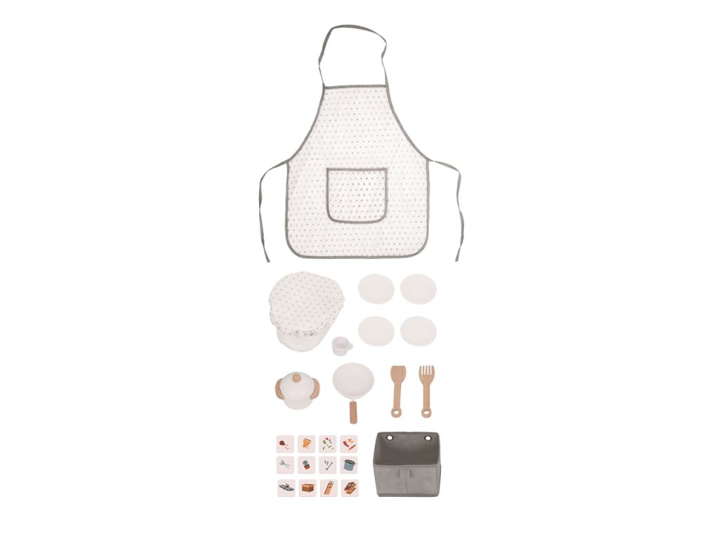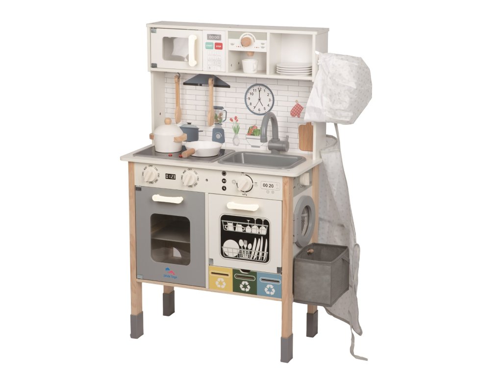 Je libo čerstvý koláček přímo z pece? Nebo snad máte zálusk na něco smaženého? S touto kuchyňkou můžete mít menu, jaké se Vám zlíbí. Je totiž plně vybavená! Najdete zde vše, co v žádné moderní kuchyni nesmí chybět - sporák s troubou, myčku, mikrovlnku, dřez, kávovar a samozřejmě nádobí s náčiním, jako jsou talíře, hrnec, pánev, hrneček a další. Na boční straně kuchyňky je umístěna pračka, ze které je možné vyprané prádlo uložit do zavěšeného odnímatelného košíku. Ani zadní strana kuchyňky nezůstala nevyužitá. Na praktickou černou tabuli mohou děti napsat vzkaz, sepsat suroviny receptů nebo něco nakreslit. Jako inspirace jim třeba poslouží zábavné mapa se zvířátky, která je také zezadu. Tak si nasaďte kuchařskou čepici, oblečte praktickou zástěru a můžete začít vařit. Jelikož nám záleží na planetě Zemi, nesmíme také zapomenout na koše na třídění! Hlavní vlastnosti: součástí je bohaté příslušenstvímultifunkční, rozmanité využitírozvíjí komunikační a sociální dovednostivyrobeno ze dřeva s certifikací FSC® Značka a certifikát FSC® (Forest Stewardship Council) zaručuje, že dřevo, ze kterého byl produkt vyroben, nebylo vytěženo nelegálně a pochází z lesů obhospodařovaných šetrným či přírodě blízkým způsobem, ve kterém jsou dodržovány přísné environmentální a sociální požadavky. Značka FSC® na výrobku znamená, že svým nákupem pomáháte chránit lesy a podporujete šetrné, odpovědné či přírodě blízké hospodaření, díky kterému jsou naše lesy stabilnější, zdravější, mají přirozenou druhovou skladbu a lépe odolávají negativním následkům klimatických změn.Doplňkové parametry