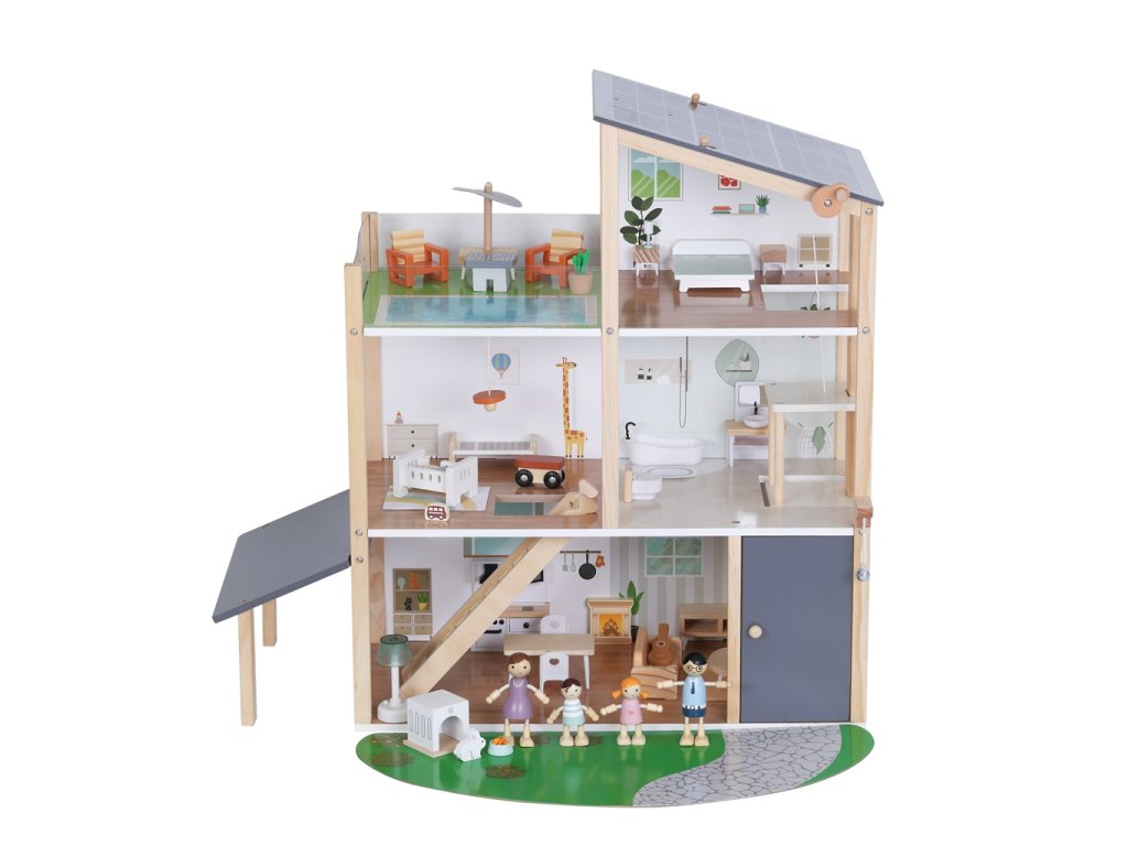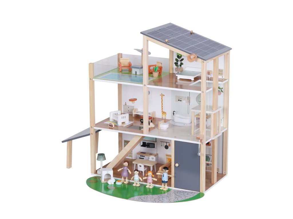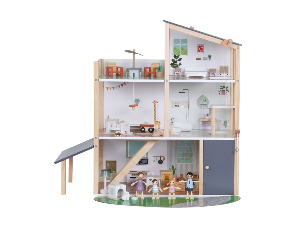 Vítejte v domečku, kde se bydlí jedna radost! Prostorný dřevěný domek je plně vybavený nábytkem i doplňky. Najdete v něm prostornou kuchyni propojenou s útulným obývacím pokojem, stylovou koupelnu s vanou, dětský pokojíček, ložnici i luxusní střešní terasu pro chvíle pohody. A aby toho nebylo málo, nechybí ani výtah. Zatočte kličkou a vyvezte rodinku až do druhého patra. Součástí sady je roztomilý domácí mazlíček králíček s vlastním domečkem a čtyřčlenná rodina připravená zabydlet se a začít psát svůj příběh. Děti si při hře rozvíjejí fantazii, sociální dovednosti i smysl pro detail. A hlavně se výborně baví! Hravý design, jemné barvy spolu s kvalitním provedením dělají z této hračky krásný doplněk každého pokojíčku nebo herny. Domeček je dodáván v rozloženém stavu a vyžaduje montáž. Návod k sestavení je součástí balení. Hlavní vlastnosti: 41 dílůplně vybavený dřevěný domeček se 4 figurkami rodinypodporuje fantazii, tvořivost a hru na rolevede k představivé hřekvalitní zpracování a atraktivní designdodáváno v rozloženém stavu, nutná montážnávod k sestavení je součástí balenívhodné pro děti od 3 letDoplňkové parametry