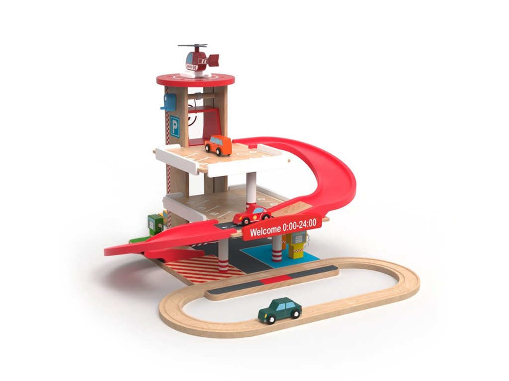 Všem automobilovým nadšencům se rozzáří oči, až uvidí barevnou garáž s výtahem a heliportem. Natankujte ekologicky u stojanu v přízemí. Vyvezte svůj vůz pomocí výtahu s klikovým pohonem a sledujte, jak sviští po rampě dolů a pokračuje dál po dráze. Stala se nehoda? Z heliportu na střeše už startuje helikoptéra. Tato edukativní hračka motivuje děti ke kreativní a představivé hře. Rozvíjí koordinaci ruka-oko, jemnou motoriku a zručnost. Garáž s parkovacími plochami na třech úrovních obsahuje také 4 autíčka a helikoptéru. Hlavní vlastnosti: garáž s heliportem a výtahem, 3 parkovací plochy, 4 autíčka, 2 palivové stojany, 1 elektro stojan, vrtulník, kolejeinspiruje ke kreativní a představivé hřerozvíjí koordinaci ruka-oko, jemnou motoriku a zručnostDoplňkové parametry