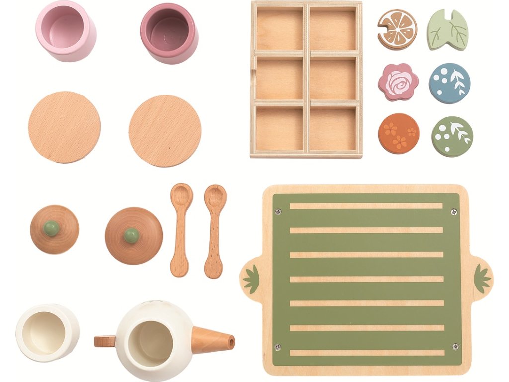 Čaj o páté? Dřevěná čajová sada potěší všechny malé milovníky čajových dýchánků. Na dřevěném podnose čekají dva šálky s podšálky a lžičkami, čajová konvice s víčkem a dóza na cukr nebo med. A co je nejlepší? V šuplíku se ukrývají „čajové sáčky“, každý s jiným motivem, které podněcují fantazii i smyslové vnímání. Hračka podporuje představivou hru, rozvíjí jemnou motoriku, koordinaci pohybů i sociální dovednosti. Děti si mohou hrát samy nebo servírovat čaj svým kamarádům nebo rodině. Příjemné pastelové a zemité odstíny barev spolu s kvalitním přírodním dřevem dělají z této hračky krásný doplněk každého pokojíčku. Obsah balení: podnos s šuplíkem2 šálky s podšálkem2 lžičkykonvice s víčkemdóza na cukr nebo med6 čajových sáčků Hlavní vlastnosti: kombinace přírodního dřeva a jemných zemitých tónůpodporuje představivou hrurozvíjí jemnou motoriku a smyslové vnímánívhodné pro samostatnou i společnou hruatraktivní doplněk do dětského pokojíčku vhodné pro děti od 3 letDoplňkové parametry