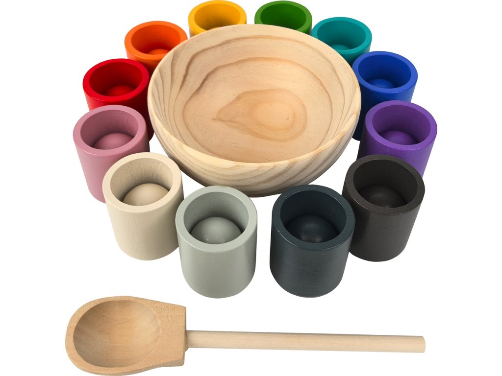 Zábavná dřevěná výuková hra inspirována Montessori hračkami. Dítě si nejlépe zdokonaluje své dovednosti pomocí hry. Umístěte kuličky do správných kalíšků podle barev pomocí lžíce. Zvládnete to vše ve správné barvě? Tato dřevěná hra nepochybně vykouzlí úsměv na tváři každého dítka. Hra pomáhá rozvíjet vnímání barev, hmatovou citlivost, motorické a vizuální dovednosti. Velmi oblíbená interaktivní hračka, která napomáhá v rozvíjení smyslů. Učí děti manipulovat s předměty a objevovat hravou formou svět tvarů a barev. Procvičuje jemnou motoriku a koordinaci ruka-oko. Vyrobeno ze 100 % certifikovaného dřeva FSC®. Inspirováno Montessori hračkami. Hlavní vlastnosti: 12 duhových barevlžíce, kalíšky, kuličky, miskavyrobeno ze 100 % certifikovaného dřeva FSC®procvičuje jemnou motorikunapomáhá v rozvíjení smyslů, podporuje soustředění a trpělivostpestré barvy Značka a certifikát FSC® (Forest Stewardship Council) zaručuje, že dřevo, ze kterého byl produkt vyroben, nebylo vytěženo nelegálně a pochází z lesů obhospodařovaných šetrným či přírodě blízkým způsobem, ve kterém jsou dodržovány přísné environmentální a sociální požadavky. Značka FSC® na výrobku znamená, že svým nákupem pomáháte chránit lesy a podporujete šetrné, odpovědné či přírodě blízké hospodaření, díky kterému jsou naše lesy stabilnější, zdravější, mají přirozenou druhovou skladbu a lépe odolávají negativním následkům klimatických změn.Doplňkové parametry