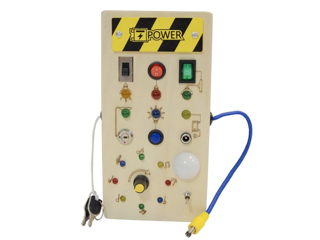 Co se stane, když zasunete zástrčku do zásuvky? Nebo když otočíte klíčkem v zámku či v zapalování? A co musíte udělat, aby se rozsvítilo světlo? Na všechny otázky odpoví tato dřevěná deska s aktivitami, která nabízí spoustu možností ke zkoumání příčiny a následku. Je zábavná a vzdělávací zároveň a podporuje zvídavost a motorické dovednosti malých dětí. Deska je vybavena řadou interaktivních prvků, jako jsou spínače, LED světýlka a další. Světla se rozsvěcují najednou nebo postupně v závislosti na vypínači a aktivují se např. pomocí přiloženého klíče, který je potřeba zasunout do zámku, a také kabelem se zástrčkou, který se zapojí do zásuvky na desce, a jsou doplněna zvuky. Tato hračka je navržena tak, aby podporovala přirozený vývoj dítěte a umožňovala objevovat okolní svět pomocí vlastního zájmu a aktivity. Je ideálním doplňkem pro trénink široké škály každodenních dovedností. Hlavní vlastnosti: ukáže dětem, jak funguje příčina a následekrozvíjí jemnou motoriku a koordinaci ruka-okopodněcuje kreativní myšlení a představivostsenzorická stimulace a edukace prostřednictvím hryvyžaduje 2x AAA baterie - nejsou součástí baleníDoplňkové parametry