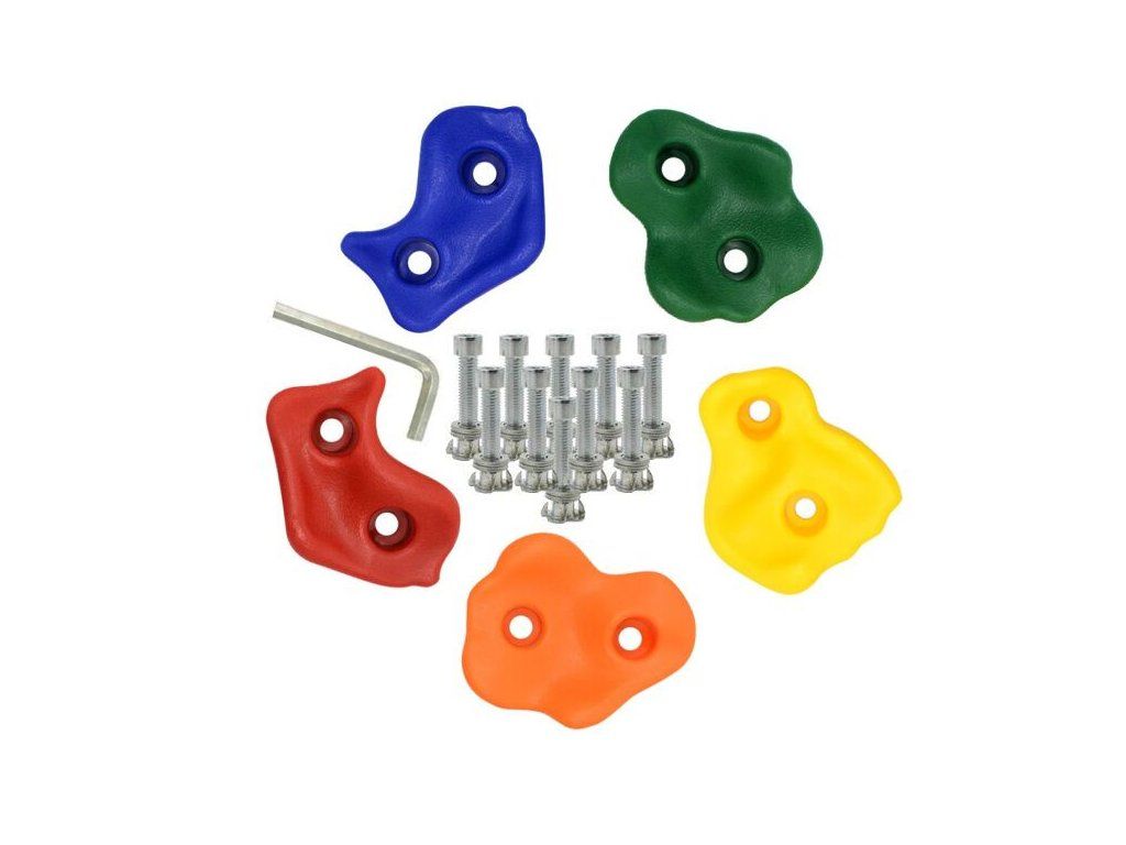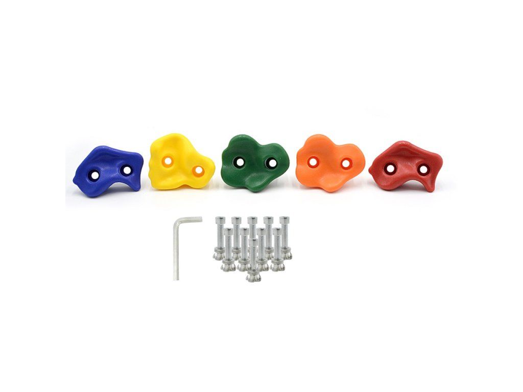 Lezecké úchyty doplní každou dětskou horolezeckou stěnu!Plastové úchyty se upevňují kovovými šrouby pomocí imbusového klíče, obojí je součástí balení.Nezbytný pomocník pro objevitele venkovní zábavy na moderním dětském hřišti. Hlavní vlastnosti: nosnost: 100 kgšrouby mají průměr 10 mm a délka je vhodná pro stěnu o tloušťce až 3 cmpevný a odolný materiálDoplňkové parametry