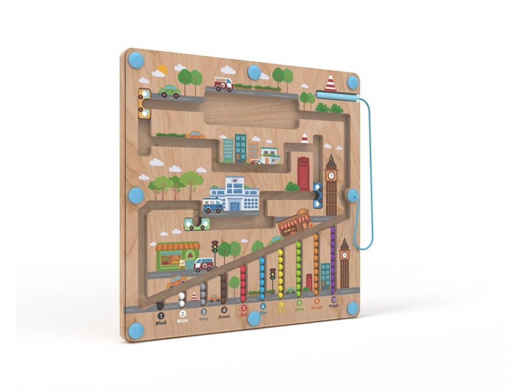 Vydejte se na cestu městem s barevnými kuličkami. Provedete úspěšně různobarevné kuličky všemi zákoutími? K převozu Vám pomohou barevné autobusy. K vedení kuliček se při hře využívá magnetické ukazovátko, které prověří dětskou trpělivost a koordinaci rukou a zraku. Dokážete pak navrátit kuličky zpět na své místo podle barvy? Zábavná dřevěná hra, která pomáhá dětem rozvíjet jemnou motoriku, orientovat se v prostoru a rozšiřovat slovní zásobu pojmenováváním barev a předmětů ve městě. Děti se také učí základy počtů formou hry. Dřevěná základna v designu města je kryta odolnou průhlednou plastovou deskou, hračka je díky tomu bezpečná. Hlavní vlastnosti: úvod do světa počtůrozvíjí motorické dovednosti dětí zábavné i bezpečné díky magnetickému principuDoplňkové parametry