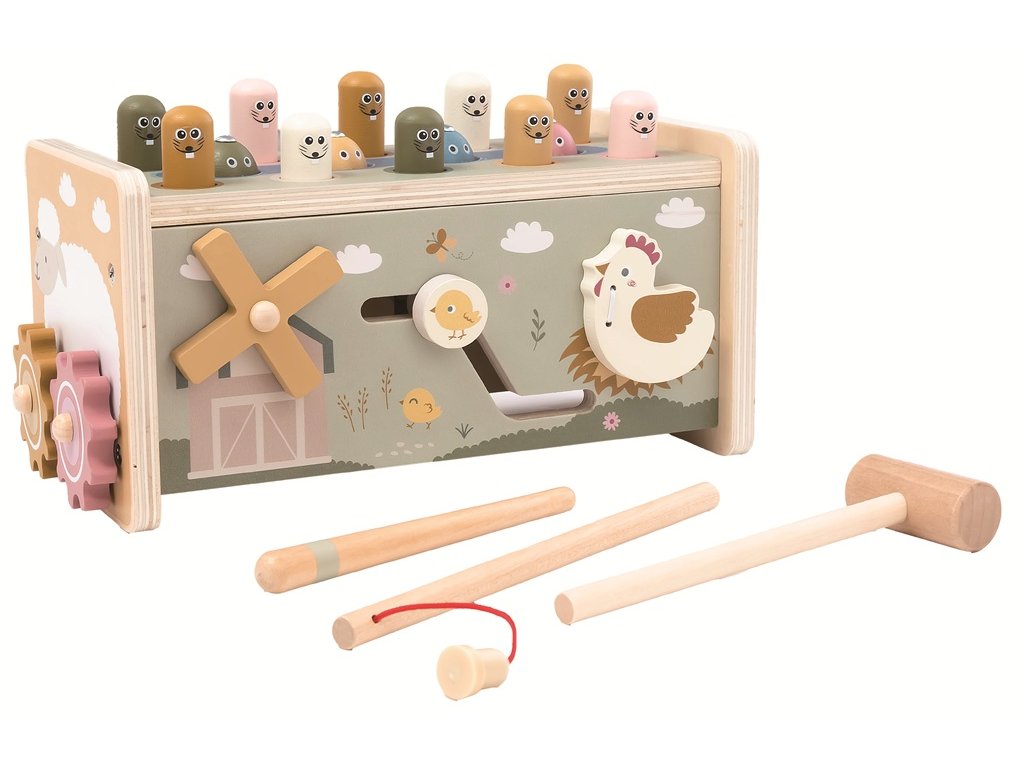 Zatloukačka, lovení rybiček, otočná ozubená kolečka a vrtule, posuvný labyrint s kuřátkem, ručičkové hodiny… A to zdaleka není všechno! Tato bohatě vybavená multifunkční hračka nabízí dětem pestré možnosti, jak si hrát a zároveň rozvíjet důležité dovednosti. Součástí je veselá zatloukačka s krtky a dřevěné kladívko, se kterým si děti procvičují sílu úderu a přesnost. Magnetická udice slouží k chytání barevných rybiček, což pomáhá rozvíjet trpělivost, koordinaci a jemnou motoriku. Nechybí ani barevný xylofon s paličkou, který rozvíjí hudební sluch a smysl pro rytmus. Díky mnoha různorodým aktivitám tato dřevěná hračka zabaví děti na dlouhou dobu a podněcuje jejich zvídavost, logické myšlení i smyslové vnímání. Vše je vyrobeno z kvalitního a bezpečného dřeva v pastelových barvách s motivy zvířátek. Xylofon není hudební nástroj, jedná se pouze o hračku. Hlavní vlastnosti: 8 dílůzatloukací hra, kladívko, udice, paličkamultifunkční hračkapodněcuje vnímavost, logické myšlení a smyslové vnímánípodporuje jemnou motoriku a koordinaci ruka-okovhodné pro děti od 2 letDoplňkové parametry