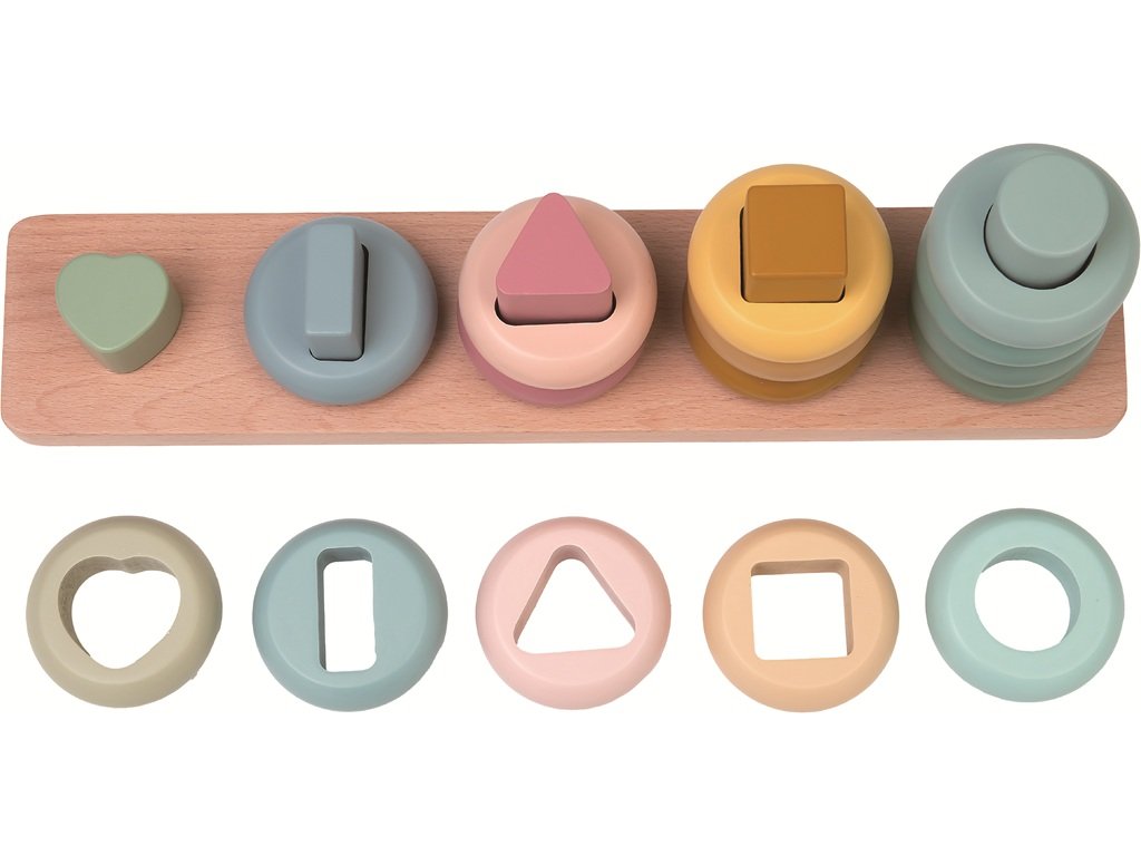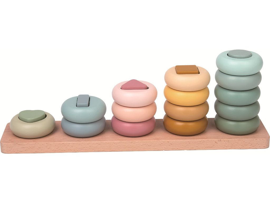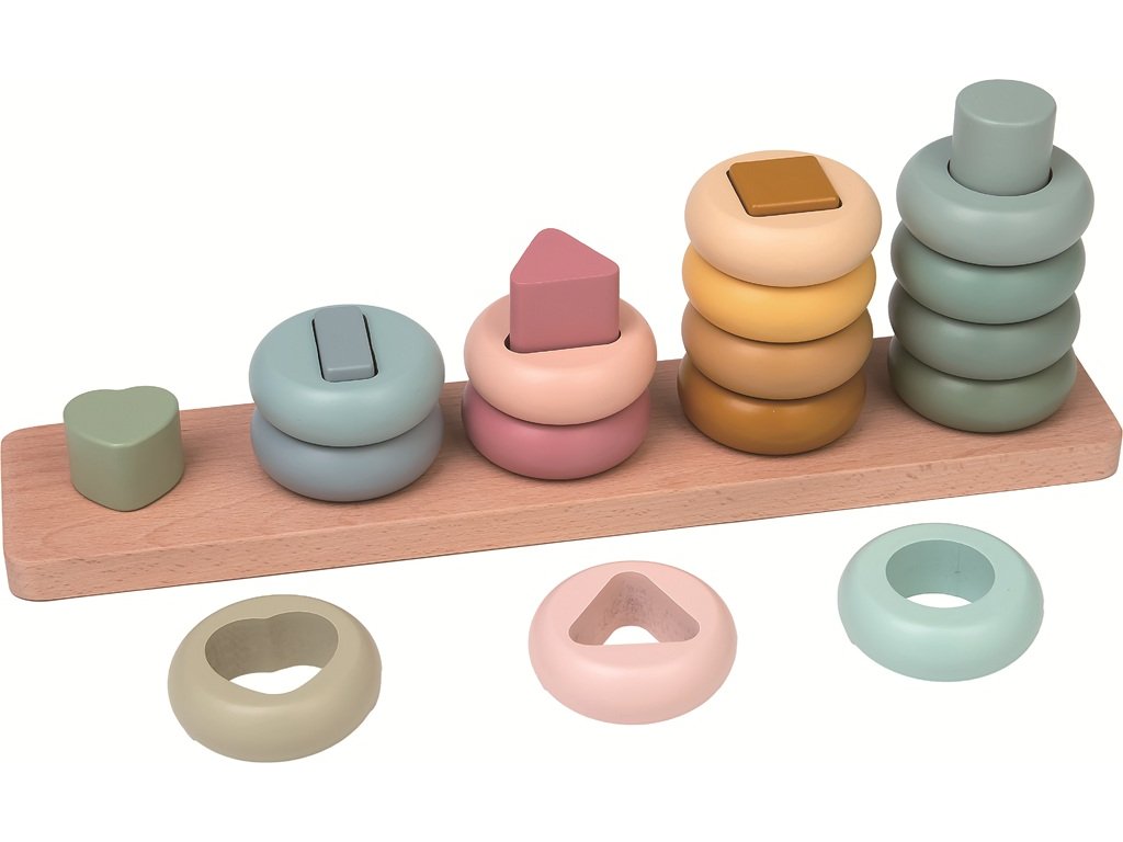 Tato chytrá nasazovačka zaujme nejen svou funkcí, ale i krásným přírodním designem v kombinaci s jemnými barvami. Na pět dřevěných tyček různého profilu, od kolečka přes srdíčko až po čtverec nebo trojúhelník děti postupně nasazují barevné kroužky, které odpovídají tvaru tyčky. Každý sloupec má jiný počet kroužků a jiný středový výřez, takže děti trénují koordinaci ruka-oko a jemnou motoriku, ale i rozpoznávání barev, tvarů a velikostí. Příjemné pastelové a zemité barvy spolu s kvalitním přírodním dřevem dělají z této hračky krásný doplněk každého pokojíčku. Hlavní vlastnosti: nasazovačka s pěti tyčemirůzné profily středůrozvíjí jemnou motoriku, logické myšlení a prostorové vnímánípodporuje učení tvarů a barevvyrobeno z kvalitního dřeva jemné přírodní a zemité barvyvhodné pro děti od 1 rokuDoplňkové parametry