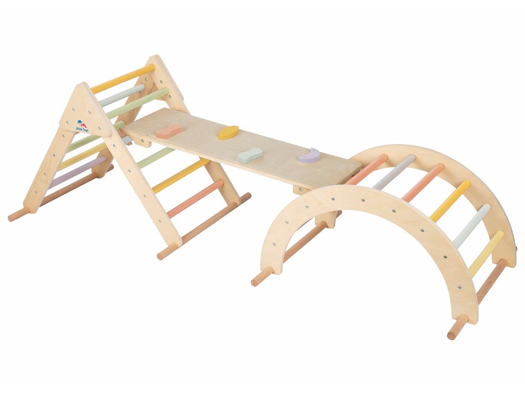 Sada Piklerové trojúhelníku, desky a oblouku nabízí nepřeberné možnosti využití pro pohybové aktivity dětí. Prvky sestavy se dají používat jednotlivě, či propojit. Trojúhelník a oblouk poslouží jako prolézačka a oblouk se otočením promění v zábavnou houpačku. Deska je buď lávkou mezi oběma prvky nebo díky připevněným chytům první tréninkovou lezeckou stěnou. Díky kombinaci přírodního dřeva a pastelových barev se stane atraktivní součástí dětského pokoje nebo herny. Piklerové trojúhelník je známou a oblíbenou pomůckou založenou na teorii pediatričky Emmy Piklerové, která vyzdvihuje důležitost pohybu a samostatného objevování pohybových možností, což hraje důležitou roli ve vývoji motoriky dětí. Při lezení, přelézání, podlézání a houpání si děti užijí spoustu zábavy, zdokonalí své motorické dovednosti, koordinaci ruka-oko, fyzickou zdatnost a posílí celé tělo. Hlavní vlastnosti: multifunkční využitínosnost 50 kgtrénuje motoriku a rovnováhuskvělý doplněk do dětského pokoje či hernylze využít k pohybové terapiivyžaduje montáž dospělé osobyvyrobeno ze dřeva s certifikací FSC® Značka a certifikát FSC® (Forest Stewardship Council) zaručuje, že dřevo, ze kterého byl produkt vyroben, nebylo vytěženo nelegálně a pochází z lesů obhospodařovaných šetrným či přírodě blízkým způsobem, ve kterém jsou dodržovány přísné environmentální a sociální požadavky. Značka FSC® na výrobku znamená, že svým nákupem pomáháte chránit lesy a podporujete šetrné, odpovědné či přírodě blízké hospodaření, díky kterému jsou naše lesy stabilnější, zdravější, mají přirozenou druhovou skladbu a lépe odolávají negativním následkům klimatických změn.Doplňkové parametry