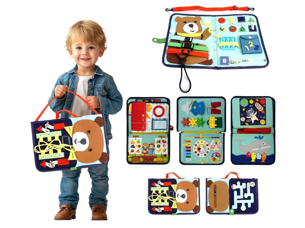 Senzorická busy kniha, to je zábava a rozvoj v jednom! Objevte kouzlo senzorické busy knihy, která zábavnou formou rozvíjí jemnou motoriku, logické myšlení, soustředění i smyslové vnímání Vašeho dítka. Kniha obsahuje různorodé motorické aktivity jako jsou knoflíky, přezky, zipy, suché zipy, tkaničky a další. Je vhodná pro hmatové, zrakové i zvukové podněty. Kniha je měkká a lehká. Perfektní jako dárek k narozeninám, Vánocům nebo jen tak pro radost i rozvoj. Hlavní vlastnosti: podporuje samostatnost a přirozenou zvídavostpodporuje rozvoj motoriky, trpělivosti a fantazieobsahuje různorodé aktivityDoplňkové parametry