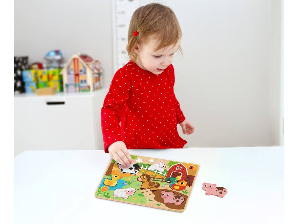 Jaký to krásný pohodový den na farmě. Toto vkládací puzzle přináší skvělou možnost, jak u našich nejmenších trénovat jemnou motoriku, trpělivost a poznávání zvířátek. Skládá se ze základny a 7 odnímatelných dílků. Hračka je vyrobena z kvalitního FSC dřeva. Má krásné ilustrace, díky kterým může také posloužit jako milá dekorace v dětském pokojíčku. Hlavní vlastnosti: obsahuje 7 vkládacích dílůrozvíjí smyslové dovednosti procvičuje jemnou motoriku a trpělivostpestrobarevná ilustrace Značka a certifikát FSC® (Forest Stewardship Council) zaručuje, že dřevo, ze kterého byl produkt vyroben, nebylo vytěženo nelegálně a pochází z lesů obhospodařovaných šetrným či přírodě blízkým způsobem, ve kterém jsou dodržovány přísné environmentální a sociální požadavky. Značka FSC® na výrobku znamená, že svým nákupem pomáháte chránit lesy a podporujete šetrné, odpovědné či přírodě blízké hospodaření, díky kterému jsou naše lesy stabilnější, zdravější, mají přirozenou druhovou skladbu a lépe odolávají negativním následkům klimatických změn.Doplňkové parametry
