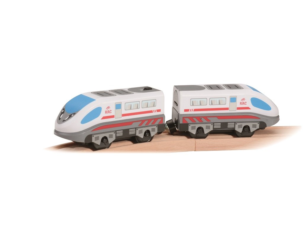 Moderní vysokorychlostní vlak na baterie v elegantním designu potěší každého malého fanouška železnice! Stylová modro-bílá souprava s realistickými detaily je ideální pro všechny děti, které milují rychlá vozidla. Lokomotiva je poháněná bateriemi a dokáže jezdit sama, takže přináší ještě víc zábavy a akce. Pomocí magnetu je propojena s vagonkem – jejich spojení je jednoduché, a děti tak mohou snadno vlak rozpojit i složit. Vlak je plně kompatibilní s běžnými dřevěnými vláčkodráhami, takže ho snadno zařadíte do již existujících herních světů. Skvělá volba pro rozvoj jemné motoriky, koordinace pohybů a dětské fantazie. Hlavní vlastnosti: lokomotiva s vagonkem v moderním designuelektrický pohon (baterie 2×AAA 1,5 V, nejsou součástí balení)dřevěné koleje nejsou součástí balenímagnetické spojování vagónůpodporuje jemnou motoriku, koordinaci a představivostkvalitní provedenívhodné pro děti od 3 letkompatibilní s vláčkodráhami ostatních výrobcůDoplňkové parametry