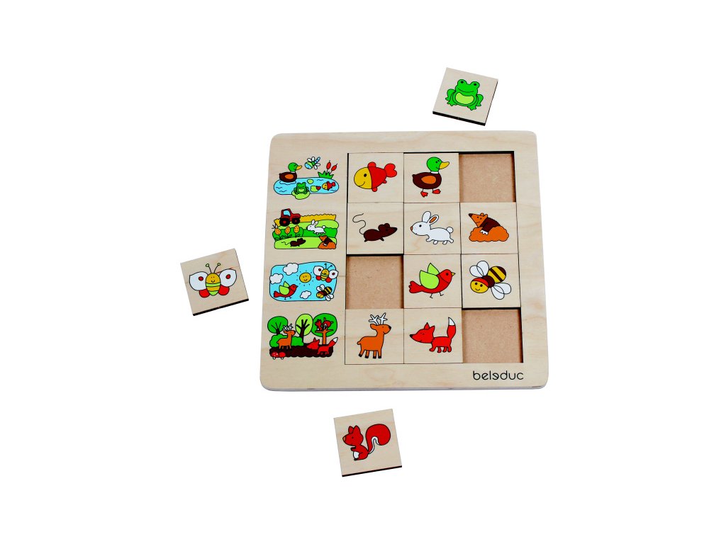 Dřevěné přiřazovací puzzle pro nejmenší děti. V této variantě přiřazují děti zvířátka do míst, kde žijí.