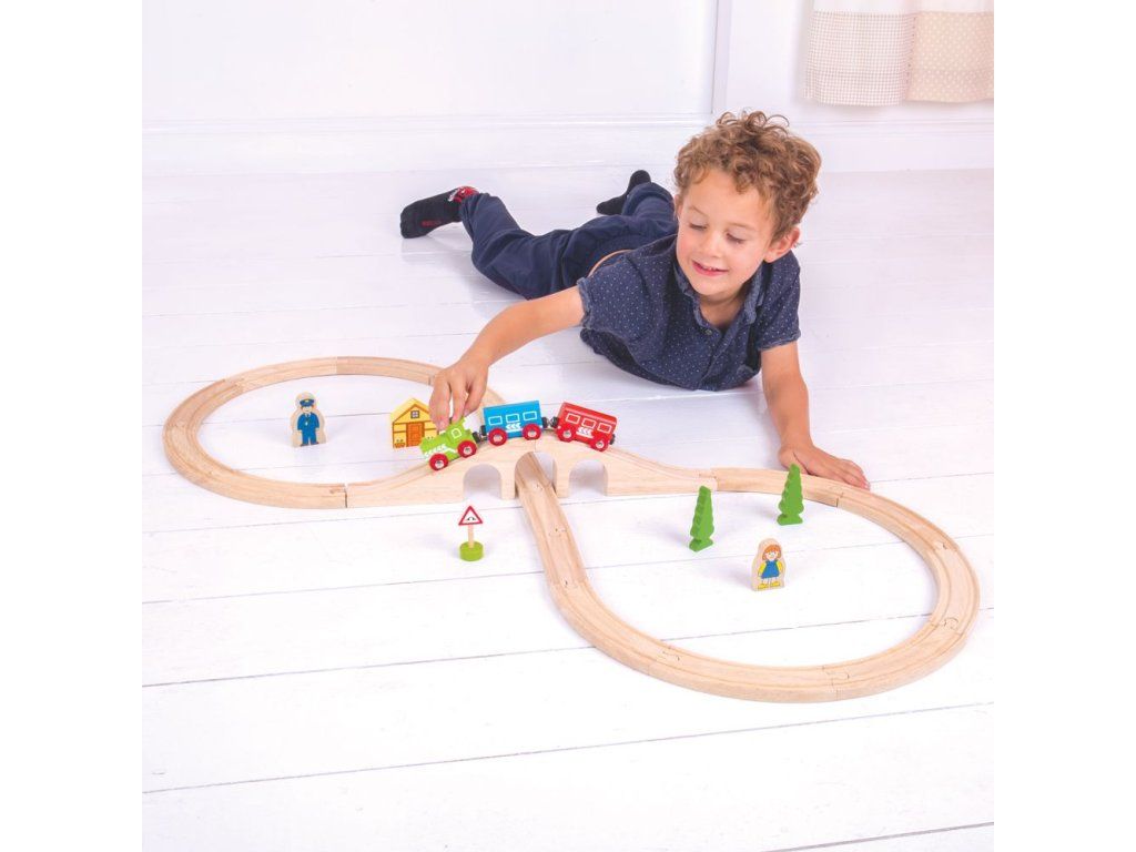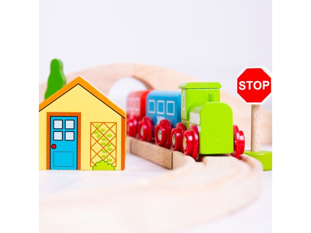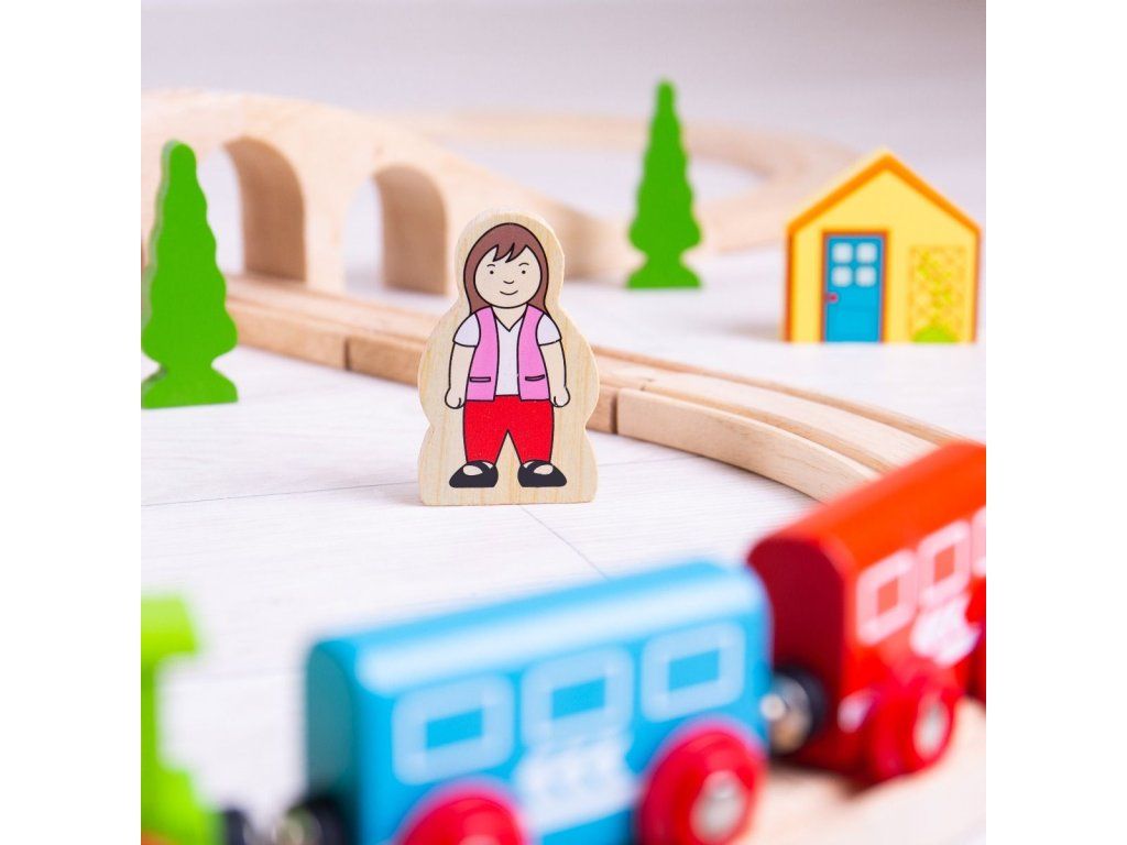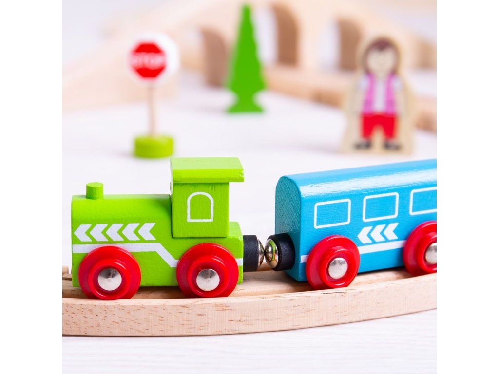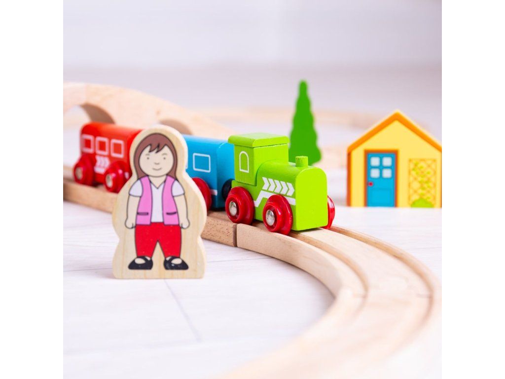 Hrací set můžete libovolně doplňovat dalšími prvky dřevěných kolejí, cest, vláčků, staveb a dalšího příslušenství z naší nabídky. Balení obsahuje: 1 ks most3 ks kolej rovná12 ks kolej zahnutá1 ks domeček1 ks lokomotiva1 ks vagónek modrý1 ks vagónek červený2 ks strom1 ks dopravní značka1 ks výpravčí1 ks holčička Hlavní vlastnosti: Vláčkodráhy a jejich příslušenství značky Bigjigs Rail je možno kombinovat se všemi dalšími dřevěnými vláčkodráhami na trhu.Vyrobeno z kvalitních a zodpovědně získaných přírodních materiálů.Odpovídá současným evropským bezpečnostním normám.Podporuje představivost, obratnost a koordinaci.Doplňkové parametry