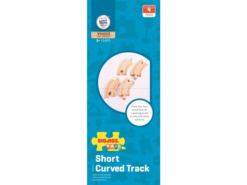 Toto balení obsahuje 4 krátké zatáčky z našeho BigJigs železničního sortimentu. Vyrobeny jsou z kvalitního tvrdého dřeva a jsou kompatibilní s dalšími dřevěnými železničními systémy našich vláčkodráh a tím se stanou skvělým přírustkem do vaší sbírky železnic. Hlavní vlastnosti: vláčkodráhy a jejich příslušenství značky Bigjigs Rail je možno kombinovat se všemi dalšími dřevěnými vláčkodráhami na trhuvyrobeno z kvalitních a zodpovědně získaných přírodních materiálůodpovídá současným evropským bezpečnostním normámpodporuje představivost, obratnost a koordinaciDoplňkové parametry