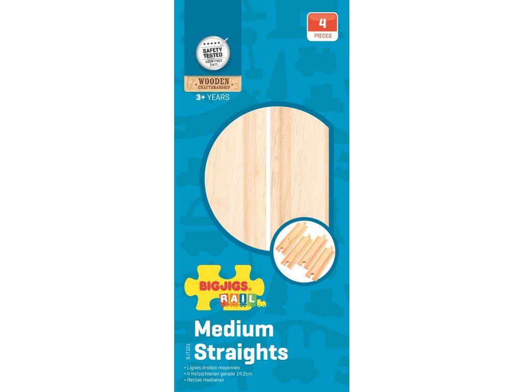Toto balení obsahuje 4 středně dlouhé rovinky z BigJigs železničního sortimentu. Vyrobeny jsou z kvalitního tvrdého dřeva a jsou kompatibilní s dalšími dřevěnými železničními systémy našich vláčkodráh a tím se stanou skvělým přírustkem do vaší sbírky železnic.Hlavní vlastnosti: vláčkodráhy a jejich příslušenství značky Bigjigs Rail je možno kombinovat se všemi dalšími dřevěnými vláčkodráhami na trhuvyrobeno z kvalitních a zodpovědně získaných přírodních materiálůodpovídá současným evropským bezpečnostním normámpodporuje představivost, obratnost a koordinaciDoplňkové parametry