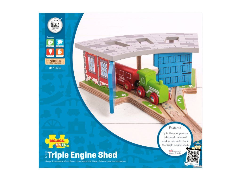 Trojité depo je skvělý způsob jak parkovat Vaše vláčky na konci dne. Chytré koleje v popředí umožňují vlakům vjet do třech různých směrů. Vláček není součástí balení. Hlavní vlastnosti: vláčkodráhy a jejich příslušenství značky Bigjigs Rail je možno kombinovat se všemi dalšími dřevěnými vláčkodráhami na trhuvyrobeno z kvalitních a zodpovědně získaných přírodních materiálůodpovídá současným evropským bezpečnostním normámpodporuje představivost, obratnost a koordinaciDoplňkové parametry