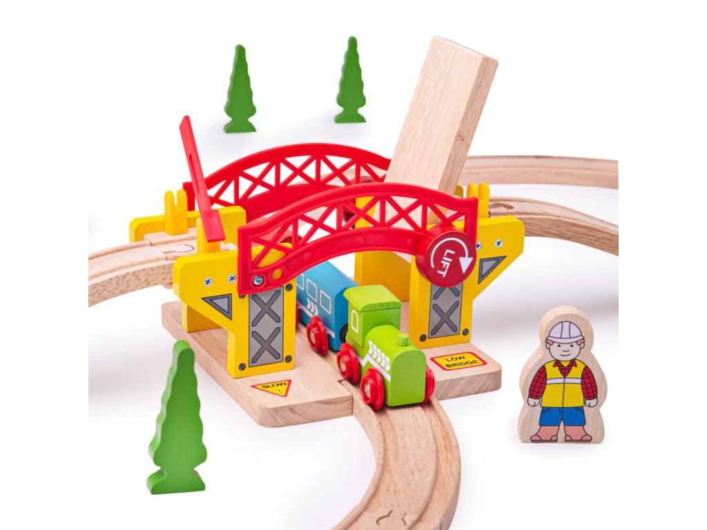 Děti milují vysoké zvedací mosty, zvedání mostu a spouštění brány. Samozřejmě i projíždějící vlaky pod nimi uspokojí nejednoho železničního inženýra. Délka mostu: 64 cm vč. nájezdů. Hlavní vlastnosti: kompatibilní se všemi dalšími dřevěnými vláčkodráhami na trhuvyrobeno z kvalitních a zodpovědně získaných přírodních materiálůodpovídá současným evropským bezpečnostním normámpodporuje představivost, obratnost a koordinaciDoplňkové parametry