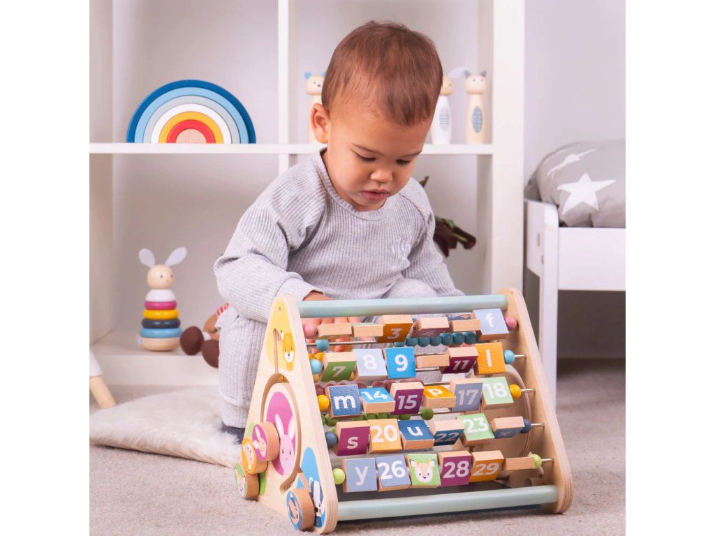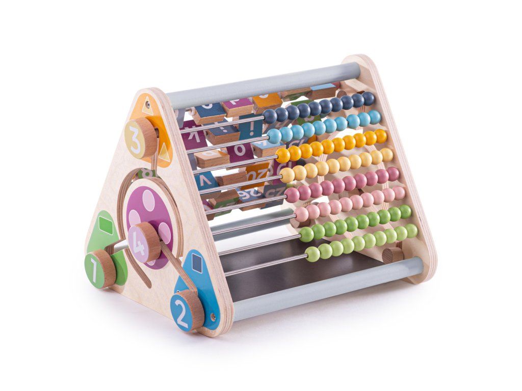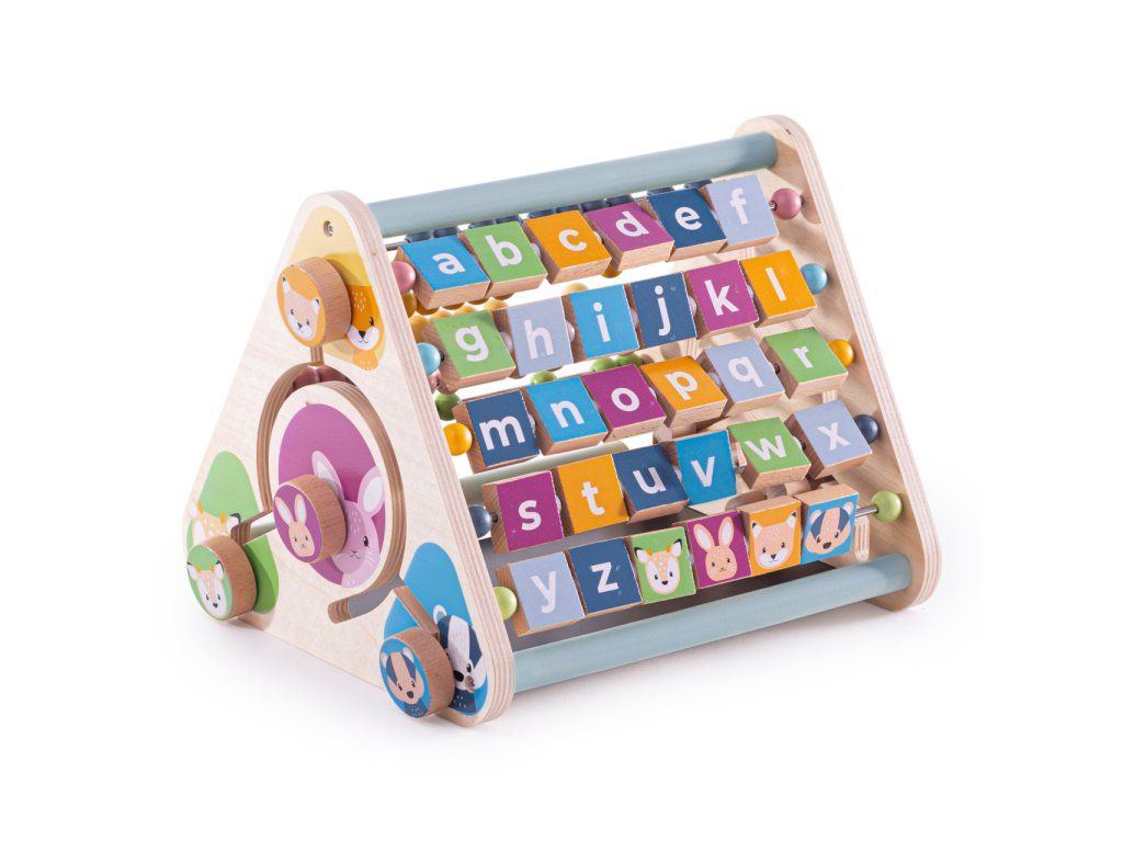 Prozkoumejte zvířecí kostky, otáčejte čtverečky s abecedou, složte zvířecí obličeje... to vše s aktivním trojúhelníkem z FSC dřeva. Pět stran plných zábavy, děti se naučí počítat s korálkovým počítadlem, naučí se také rozeznávat zvířata a mnoho dalšího.Kromě již zmíněných aktivit zde najdete také křídovou tabuli, počítadlo, kostky pomohou s tréninkem jemné motoriky dětí. Nejlepší na hračce je, že nemá žádné oddělitelné dílky! Tento dřevěný aktivní trojúhelník pomůže také s rozvojem zručnosti a koordinace.Vyrobeno z kvalitních materiálů ze zodpovědných zdrojů. Malováno netoxickými barvami, které jsou bezpečné pro děti. Splňuje ASTM F963 a evropské bezpečnostní standardy. Hlavní vlastnosti: 5 stran aktivitbez odnímatelných dílků100% FSC dřevo Značka a certifikát FSC® (Forest Stewardship Council) zaručuje, že dřevo, ze kterého byl produkt vyroben, nebylo vytěženo nelegálně a pochází z lesů obhospodařovaných šetrným či přírodě blízkým způsobem, ve kterém jsou dodržovány přísné environmentální a sociální požadavky. Značka FSC® na výrobku znamená, že svým nákupem pomáháte chránit lesy a podporujete šetrné, odpovědné či přírodě blízké hospodaření, díky kterému jsou naše lesy stabilnější, zdravější, mají přirozenou druhovou skladbu a lépe odolávají negativním následkům klimatických změn.Doplňkové parametry
