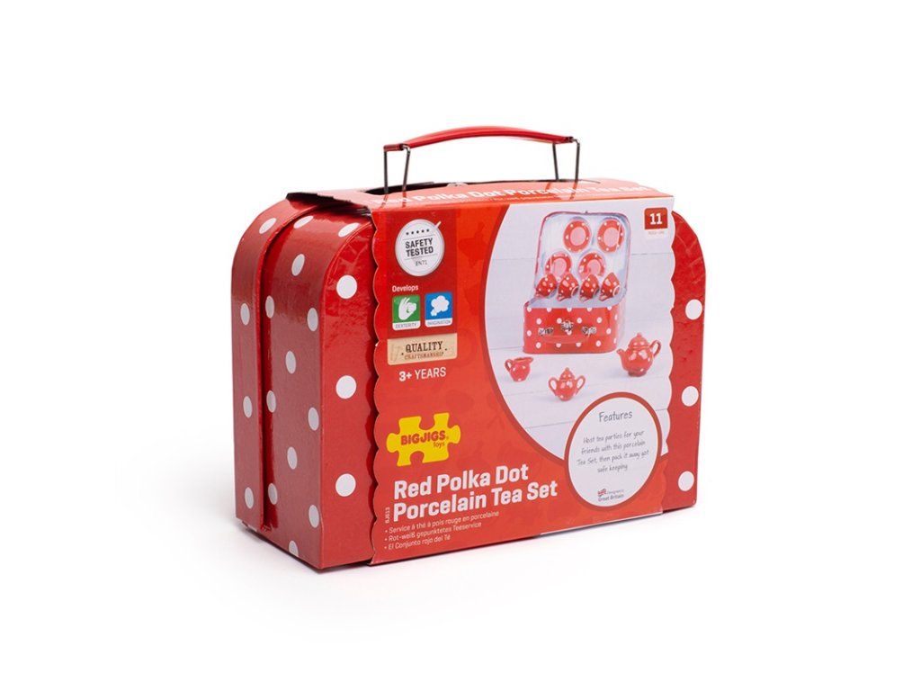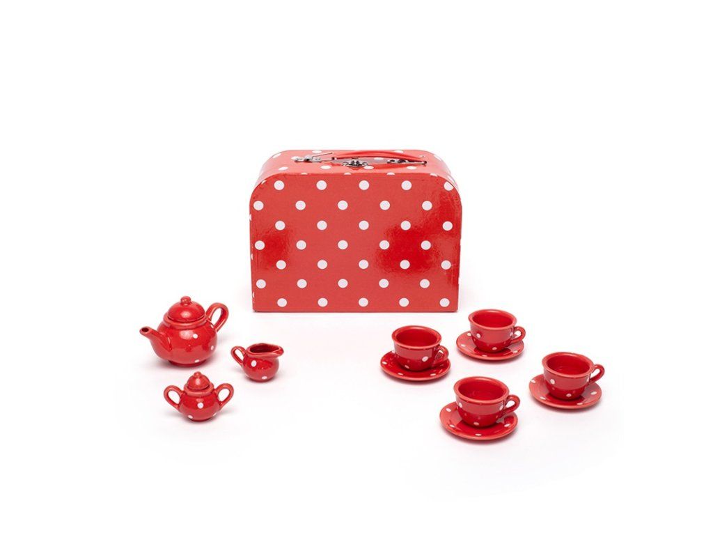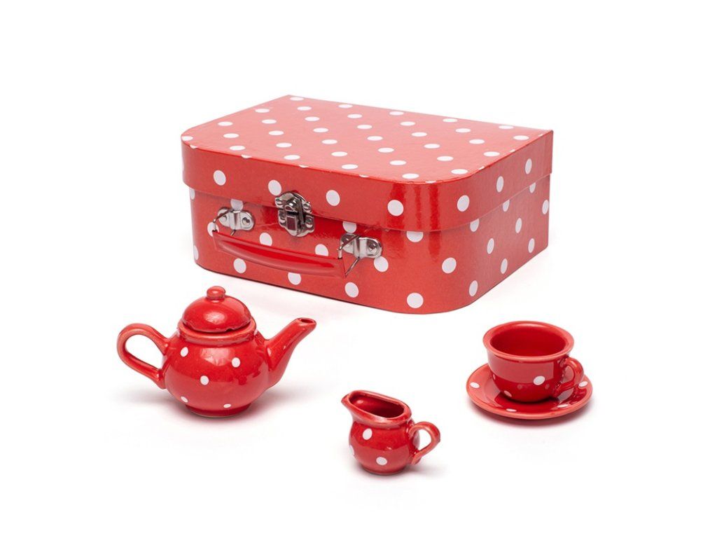 Vychutnejte si elegantní čajový dýchánek s touto porcelánovou čajovou soupravou. Zahrnuje čtyři šálky a podšálky, konvici, cukřenku a džbánek na mléko. Po ukončení hry, nebo když je čas na cestování, jednoduše uložte čajovou soupravu bezpečně na odpovídající místa v kufříku. Splňuje platné evropské bezpečnostní normy. Skládá se z 12 hracích prvků. Hlavní vlastnosti: 12 hracích prvkůčervená souprava s bílými puntíkypodporuje kreativitu a představivostDoplňkové parametry