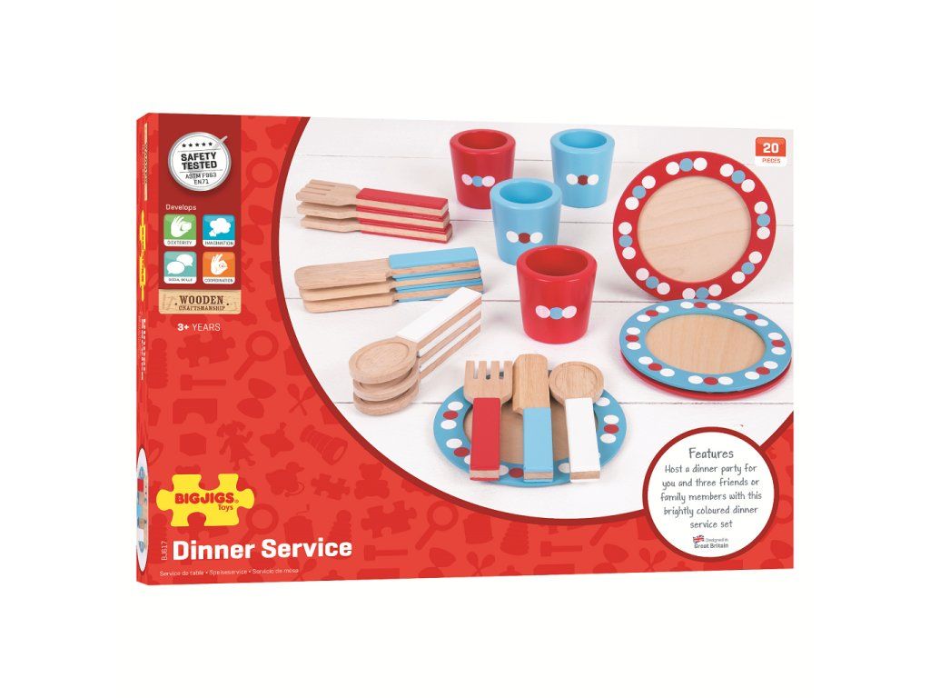 Začínající mladí kuchaři mohou nachystat vlastní večeři a uspořádat čajové dýchánky s touto barevnou dřevěnou jídelní sadou. Set je dodáván se 4 dřevěnými talíři, hrnky, noži, vidličkami a lžícemi, což z ní dělá skvělý doplněk do každé dřevěné kuchyňky na hraní. Dřevěná sada nádobí Bigjigs Toys, která nabízí hodiny zábavy a nekonečné herní možnosti, je skvělým způsobem, jak podpořit nápaditost a kreativitu. Vyrobeno z vysoce kvalitních, zodpovědně získaných materiálů. Splňuje aktuální evropské bezpečnostní normy. Hlavní vlastnosti: jídelní servis s puntíky v jemných barvách20 kusů nádobíideální doplněk do dětské kuchyňkypodporuje kreativitu a nápaditostDoplňkové parametry