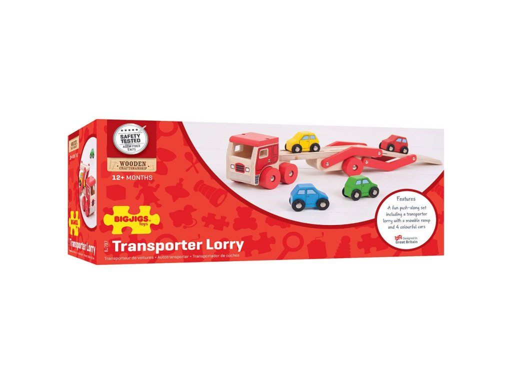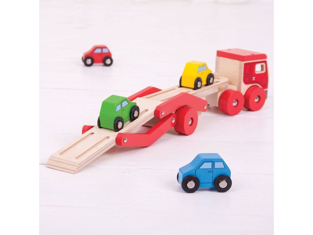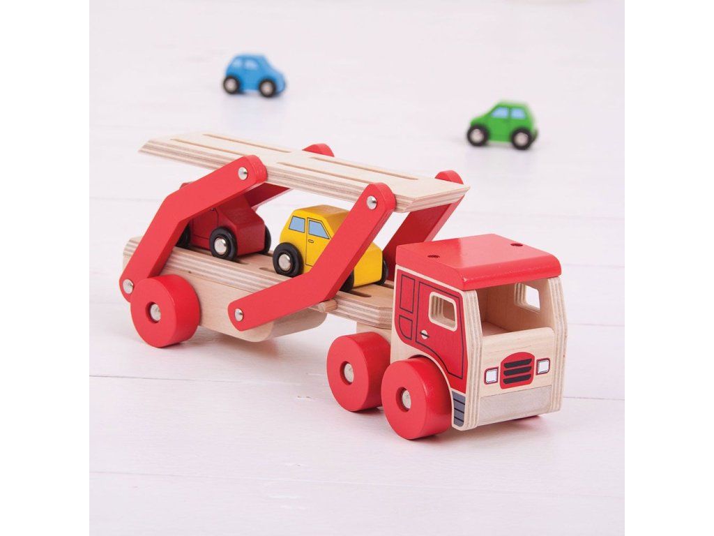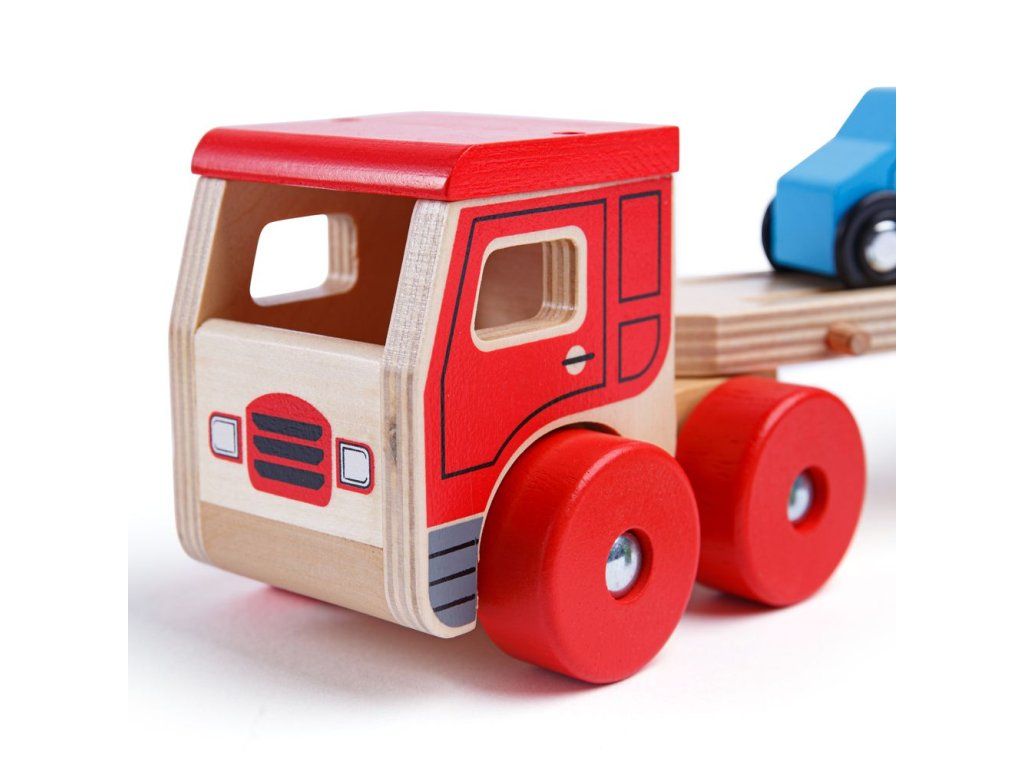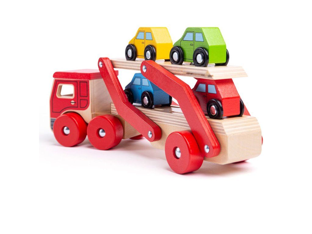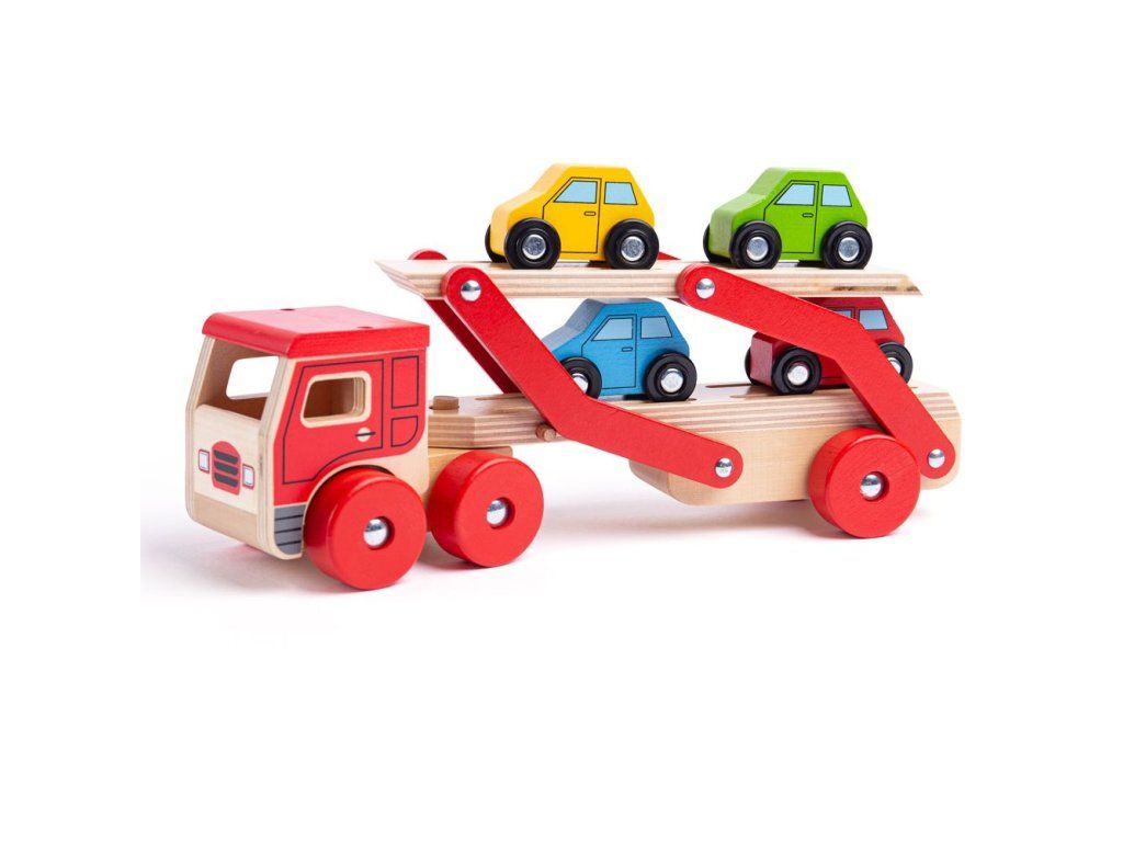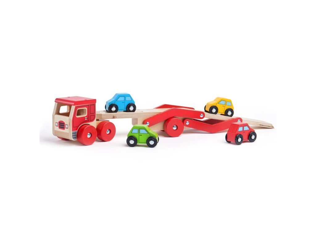 Tento dřevěný transportér pomáhá rozvíjet obratnost a koordinaci. Veze náklad čtyř pestrobarevných dřevěných aut. Horní část návěsu lze snadno snížit, aby mohlo každé vozidlo najíždět. Srážky v podlaze přívěsu pomáhají udržet každé auto na místě, když je přepravováno na místo určení. Vyrobeno z vysoce kvalitních, zodpovědně získaných materiálů. Splňuje aktuální evropské bezpečnostní normy. Hlavní vlastnosti: návěs lze snížit a po naložení zvýšitkamión s návěsem s 4 autíčkyvyrobeno z vysoce kvalitních, zodpovědně získaných materiálůsplňuje aktuální evropské bezpečnostní normyDoplňkové parametry