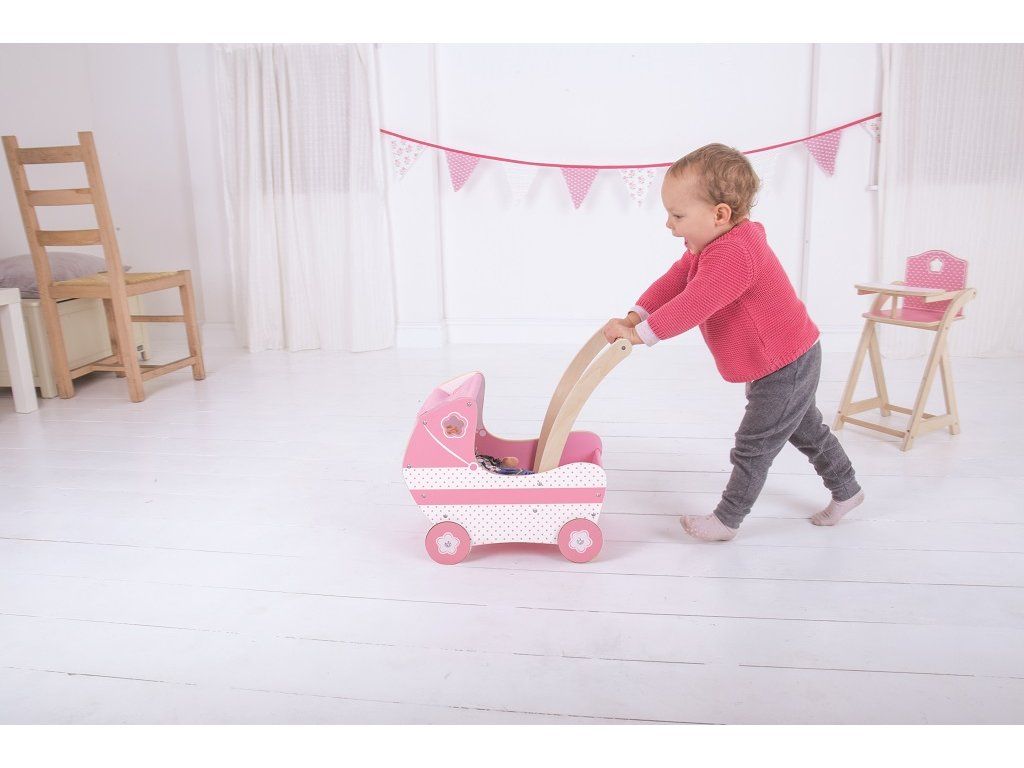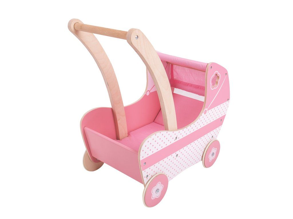 Dřevěný kočárek pro panenky v krásné růžové barvě s látkovou stříškou a precizně vyřezávanými detaily. Kočárek obsahuje jednoduchou vystélku, aby panenky cestovaly pohodlně. Pevná kola jsou opatřena gumovým proužkem pro tichý chod i na tvrdých podlahách. Pohodlně uchopitelné madlo a stabilní konstrukce zaručují zábavu při hře. Pomáhá inspirovat kreativní hraní rolí a rozvíjí sociální dovednosti. Vyžaduje montáž. Vyrobeno z vysoce kvalitních, zodpovědně získaných materiálů. Splňuje aktuální evropské bezpečnostní normy. Lze jej využít i jako dekoraci. Hlavní vlastnosti: rozvíjí kreativitu a sociální dovednostipohodlně uchopitelné madlo a stabilní konstrukceobsahuje jednoduchou vnitřní vystélkupogumovaná pevná kolaDoplňkové parametry