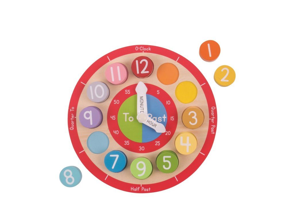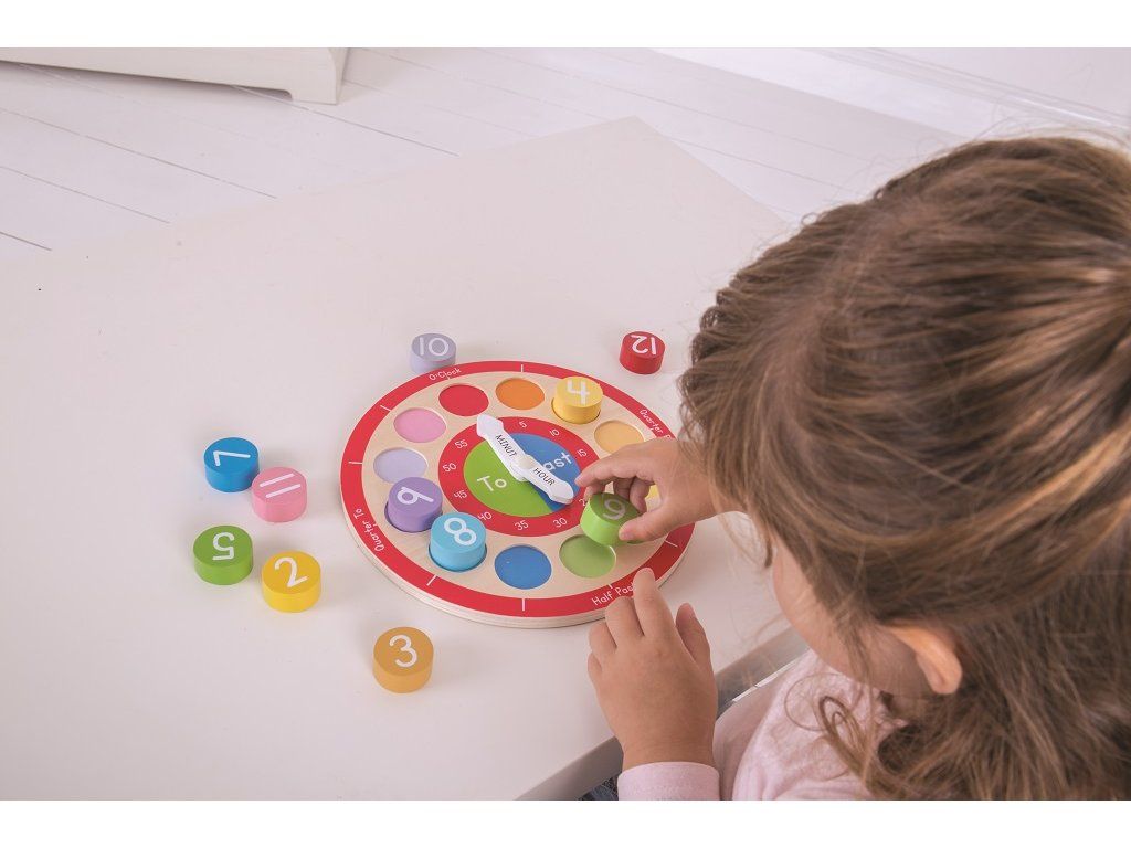 Jednoduchá hračka s tolika příležitostmi k učení – edukativní hodiny od Bigjigs Toys vytvářejí zábavný způsob, jak se učit o číslech, tvarech, barvách a poznávání času. Hodiny obsahují 12 kulatých odnímatelných dílků s čísly 1 až 12. Každý dílek je barevně sladěn se základním slotem, aby se rozvíjely schopnosti rozpoznávání. K dispozici je rozdělení na minuty a části hodiny, které děti naučí rozlišovat čas. Pochopí i rozdělení „čtvrt na“, „tři čtvrtě na“, „půl na“ a další! Pomáhá rozvíjet zručnost, smyslové dovednosti a koncentraci. Vyrobeno z vysoce kvalitních, zodpovědně získaných materiálů. Splňuje aktuální evropské bezpečnostní normy. Hlavní vlastnosti: obsahuje 12 odnímatelných dílů s číslyzákladní deska s popisy v angličtinězábavné učení se o číslech, tvarech, barvách a poznávání časuDoplňkové parametry