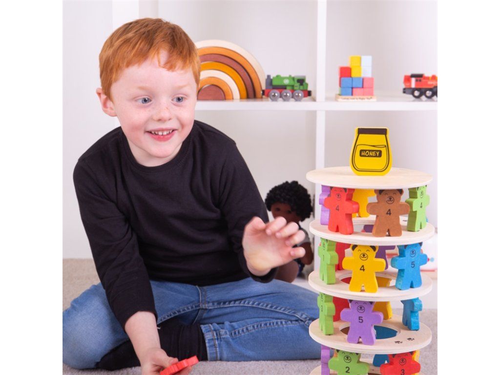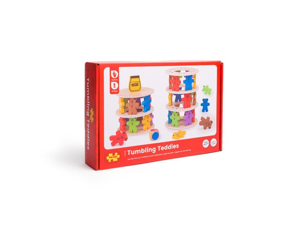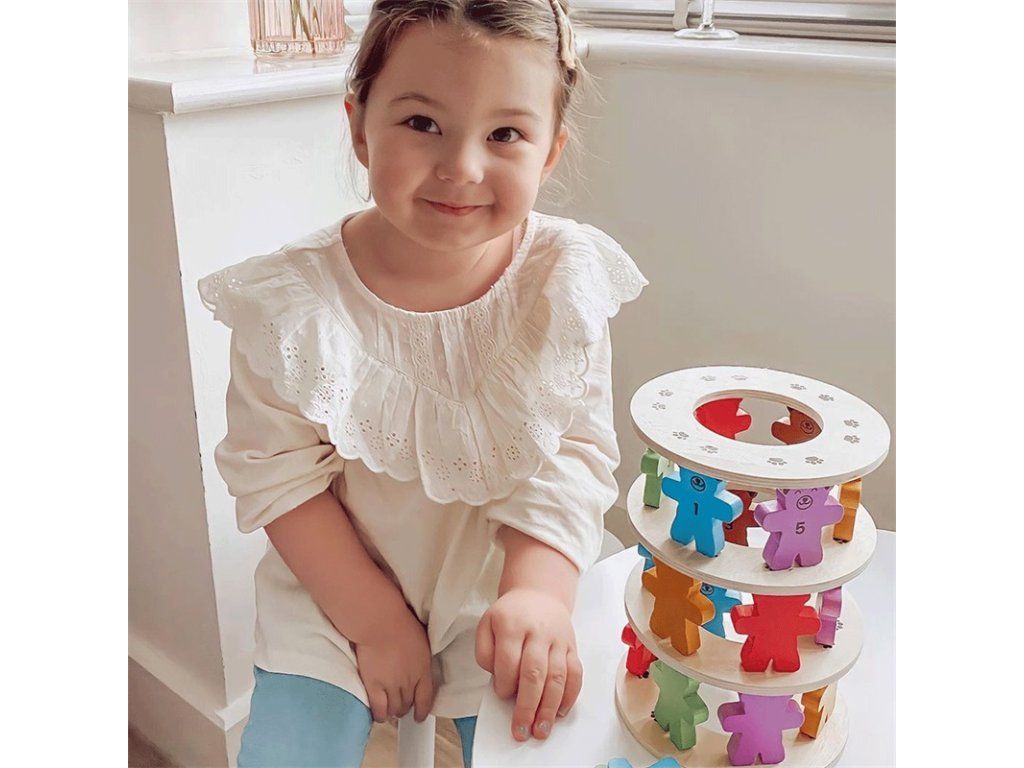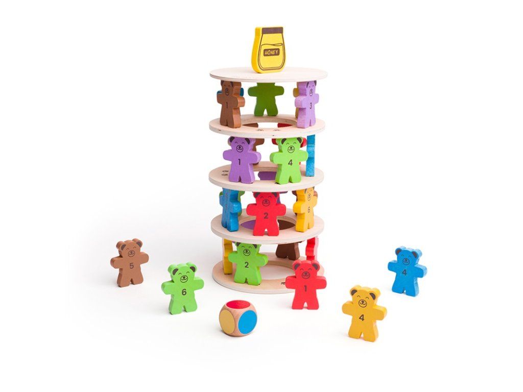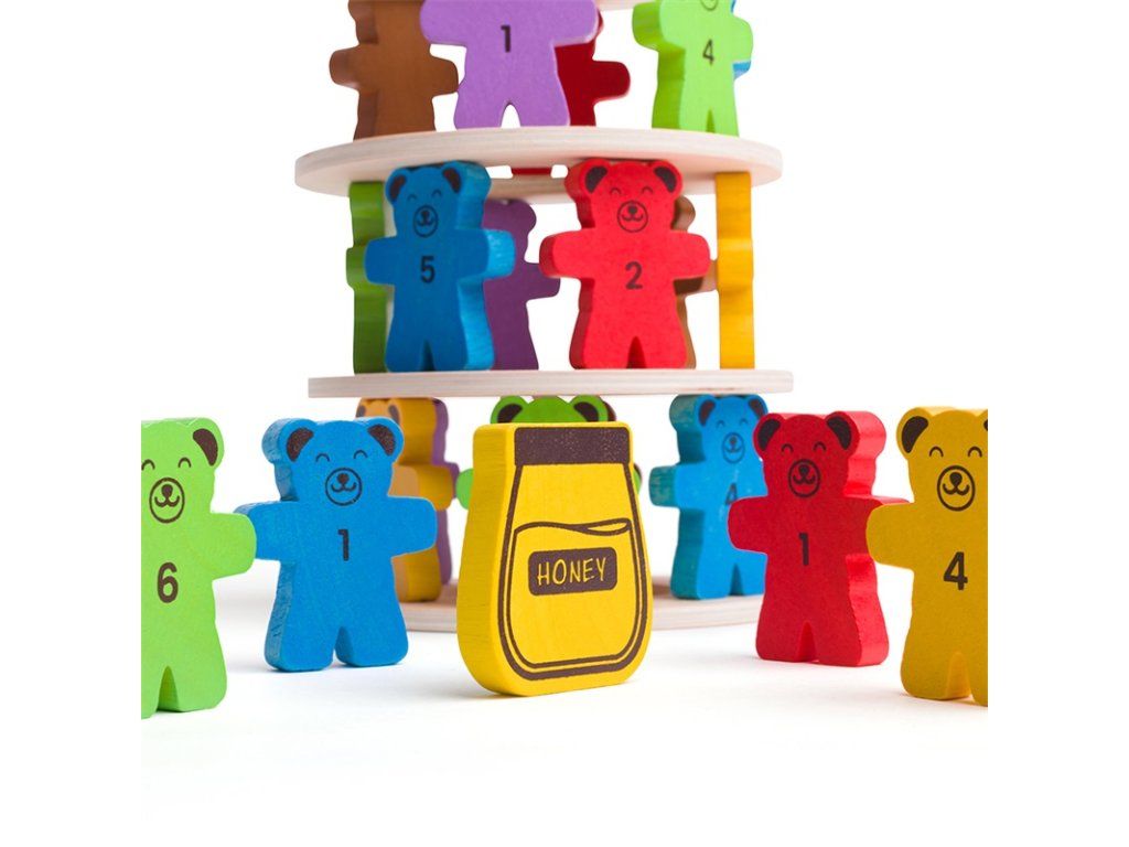 Kdo shodí sklenici medu jako první? Postavte za pomoci medvídků věž. Hoďte si kostkou, která určí barvu medvěda, na první dřevěný kruh postavte 6 medvědů a poté na ně položte další dřevěný kruh. Tento postup opakujte. Ale pozor, ať vám medvědí věž nespadne! Vyrobeno z kvalitních materiálů ze zodpovědných zdrojů. Splňuje evropské bezpečnostní standardy. Vhodné od 3 let. Hlavní vlastnosti: 6 mezikruží a víko, 36 figur medvědů, figura džbánu a kostkarobustní a odolné provedenívyrobeno s ohledy na udržitelnostDoplňkové parametry