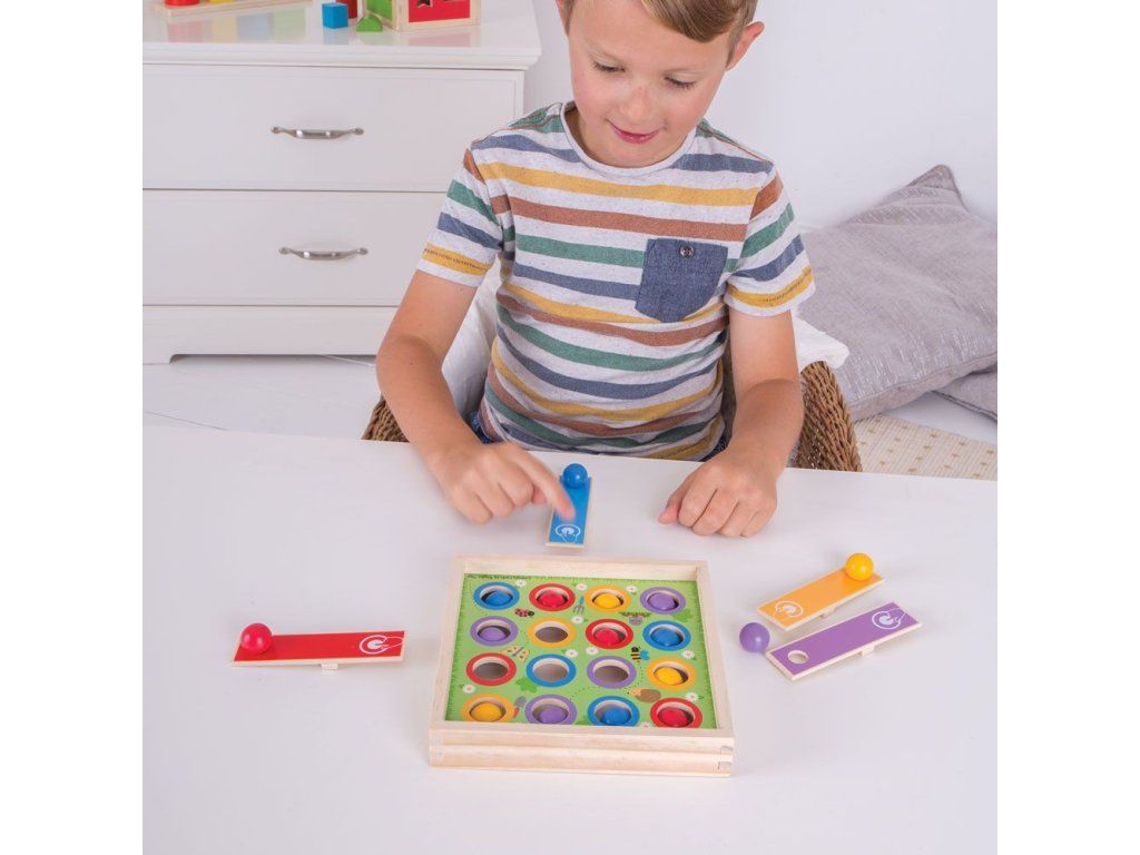 Hra zaměřená na dovednost a přesnost! Hráči se musí střídat tak, aby umístili barevnou kouli do odpovídající dírky na desce. Hráč, který zvládne umístit všechny čtyři barevné koule do děr, vyhraje! Hra může být hrána až 4 hráči se čtyřmi různými barvami na desce - červená, modrá, žlutá a fialová. Skvělý způsob, jak rozvíjet dovednost soustředění a pozorování, a zlepšuje schopnost počítat. Podporuje interaktivní hrací sekce a rozvíjí slovní zásobu. Vyrobeno z vysoce kvalitních, zodpovědně dodávaných materiálů. Odpovídá současným evropským bezpečnostním normám. Hlavní vlastnosti: podporuje soustředění a přesnosthra pro až 4 hráčedřevěná obdoba klasického kloboučku hopDoplňkové parametry