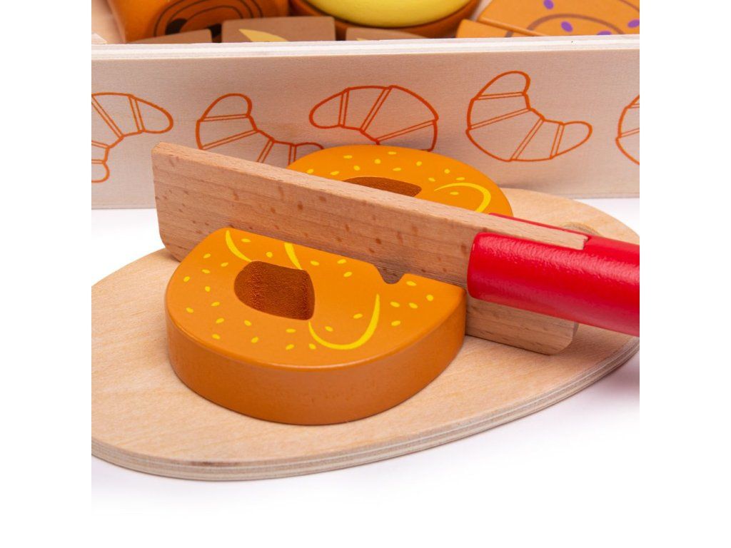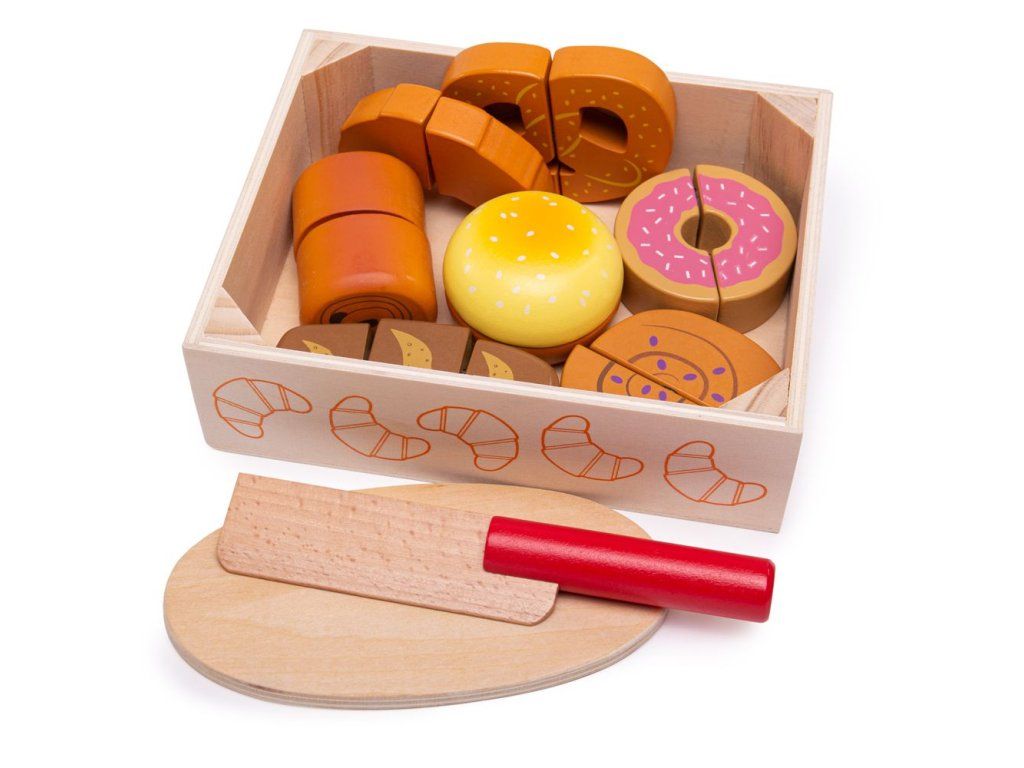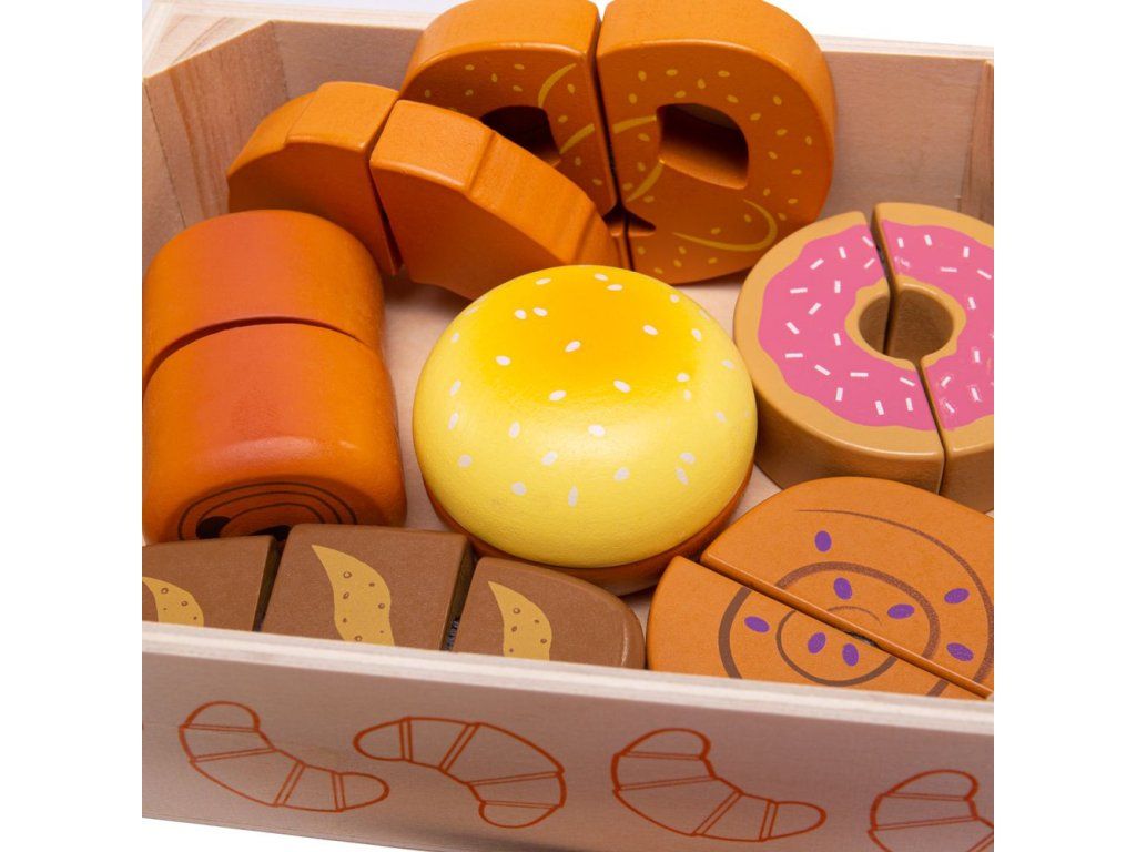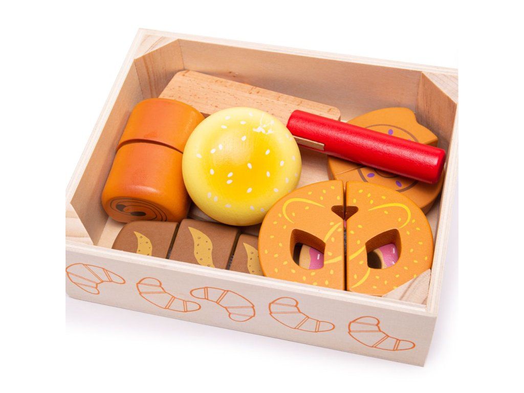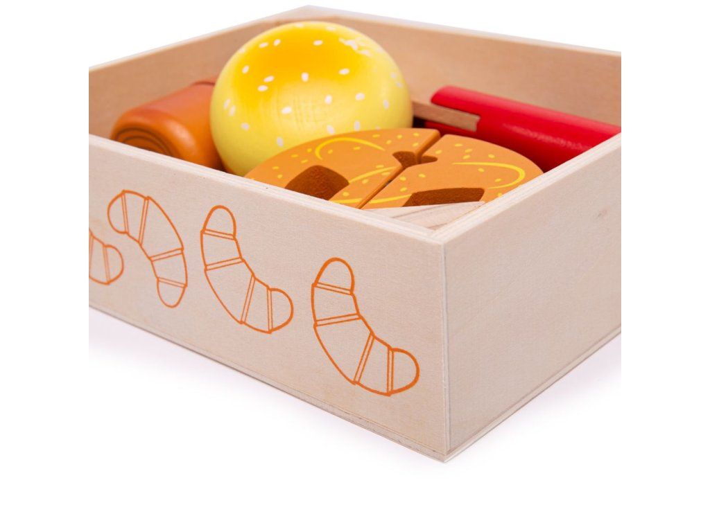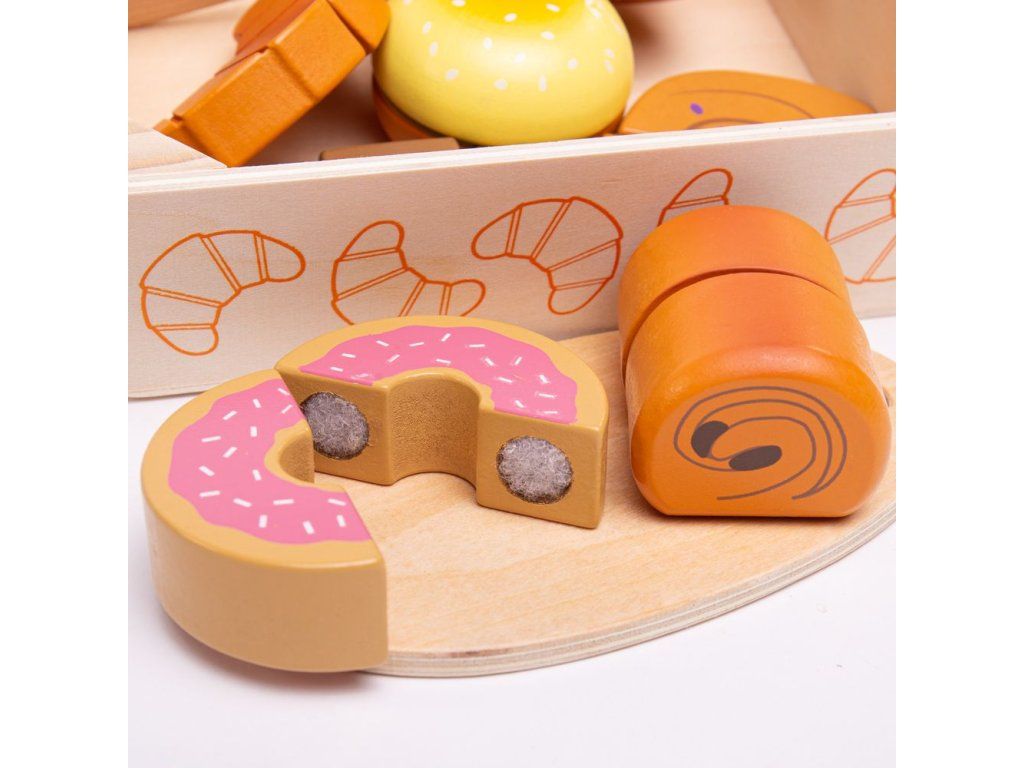Čerstvé pečivo přímo z pekárny. Set obsahuje chutné pekařské lahůdky včetně croissantu, koblihy, chleba a další! Potraviny, které jsou spojeny suchým zipem, je možné krájet pomocí přiloženého dřevěného nože. Skvělý doplněk pro všechny začínající kuchaře. Bigjigs Toys dřevěné jídlo je ideální, aby pomohlo vašemu dítěti dozvědět se o významu zdravé a vyvážené stravy, odkud pochází naše jídlo a jak jídlo připravujeme. Po ukončení hry může dítě dřevěné potraviny uložit do praktické dřevěné krabičky. Hlavní vlastnosti: dřevěné potraviny spojené suchým zipemrozvíjí motoriku dětíučí správnému stravováníDoplňkové parametry