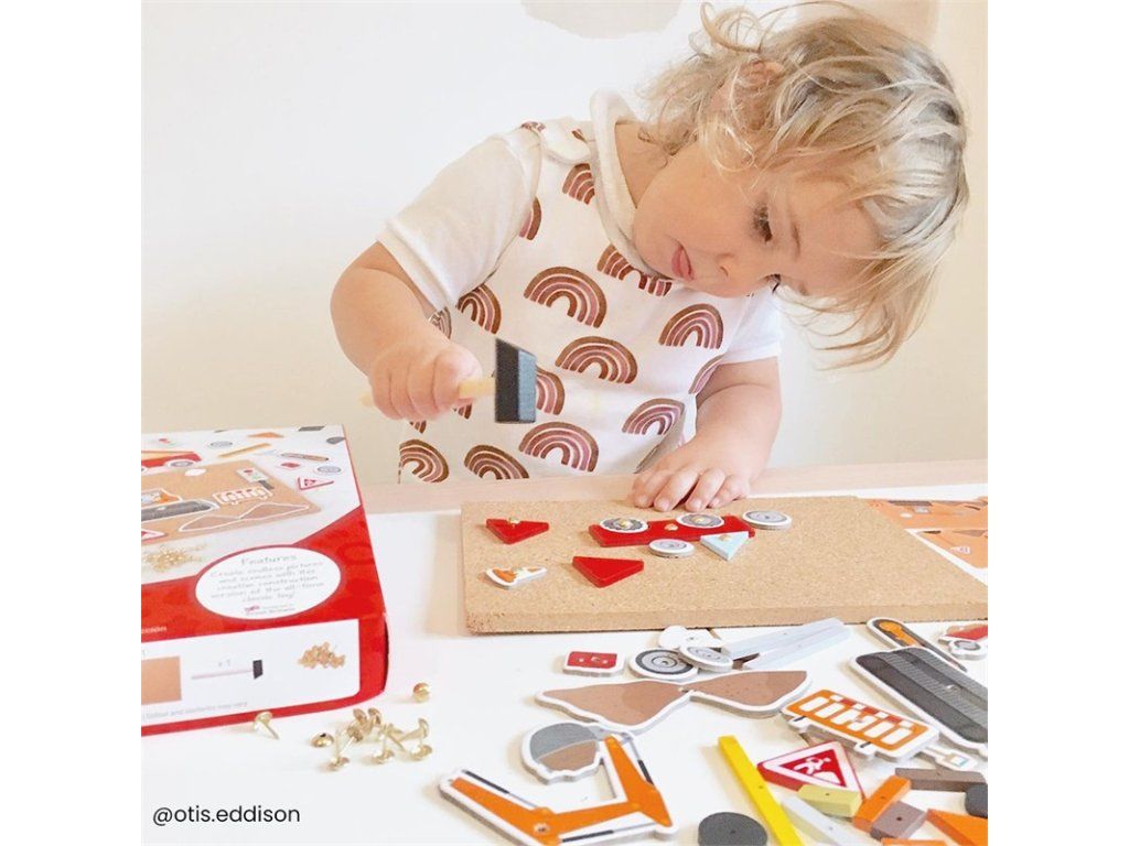 Připínací desky, oblíbené mezi generacemi, nikdy nevyjdou z módy. Pestrobarevné dřevěné tvary lze kombinovat nejen dle přiložených předloh, přiloženým kladivem připínat na korkovou desku pomocí lesklých připínáčků (součástí balení), a vytvářet tak nekonečné množství různých stavebních scén. Obsahuje stavební vozidla, nářadí, značení atd. Hra poslouží jak individuálním, tak interaktivním vzdělávacím a kreativním hrám. Rozvíjí jemnou motoriku, koordinaci ruka-oko, zručnost a soustředění. Vyhovuje současným evropským bezpečnostním normám. Hlavní vlastnosti: kompletní sada bezprostředně připravená ke hřeDoplňkové parametry
