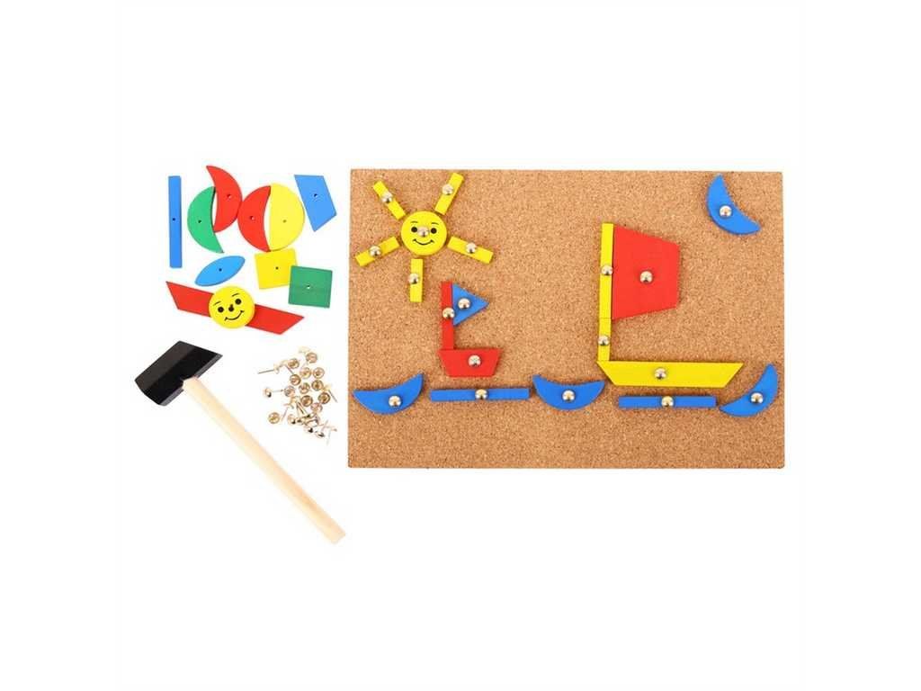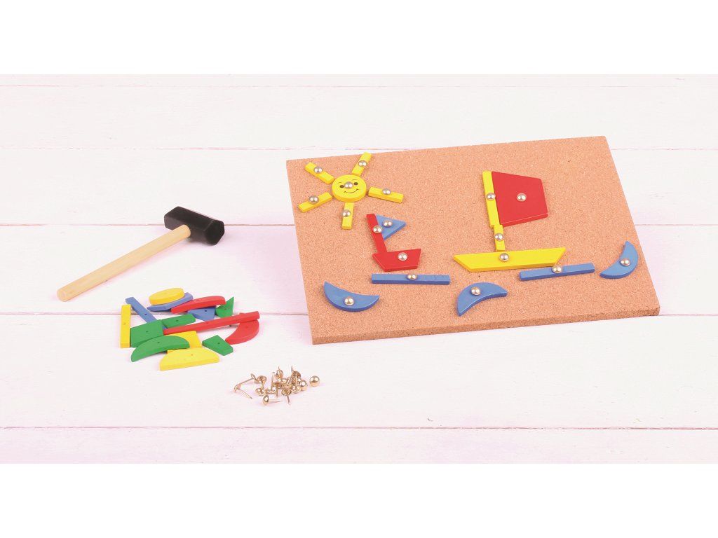 Připínací desky, oblíbené mezi generacemi, nikdy nevyjdou z módy. Pestrobarevné dřevěné tvary lze kombinovat nejen dle přiložených předloh, přiloženým kladivem připínat na korkovou desku pomocí lesklých připínáčků (součástí balení), a vytvářet tak nekonečné množství různých stavebních scén. Zahrnuta jsou stavební vozidla, nářadí, značení atd. Hra poslouží jak individuálním, tak interaktivním vzdělávacím a kreativním hrám. Rozvíjí jemnou motoriku, koordinaci zraku a rukou, obratnost a soustředění. Vyhovuje současným evropským bezpečnostním normám. Hlavní vlastnosti: kompletní sada bezprostředně připravená ke hřeDoplňkové parametry