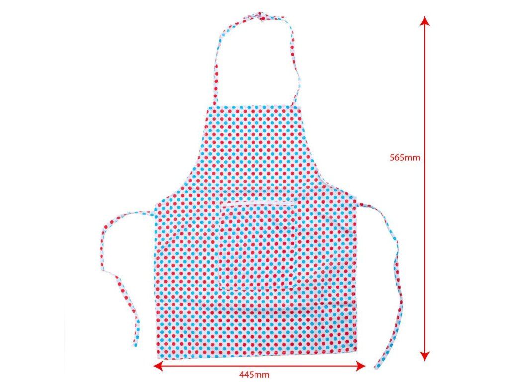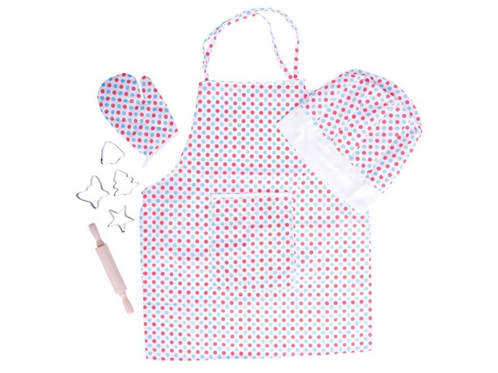 Mladí kuchaři budou milovat tuto světlou puntikovanou bavlněnou sadu k pečení nebo vaření, která obsahuje zástěru, chňapku, kuchařskou čepici, váleček a vykrajovátka. Ideální pro použití v asistovaném vaření nebo pečení, nebo pro použití v našem dřevěném kuchyňském sortimentu, jako součást hracích rolí, které si vaše dítě jistě rádo ztvární. Hlavní vlastnosti: čepice: zapínání na suchý zips, obvod cca 47-51 cmrukavice - délka 17 cmzástěrka - délka: bez šňůrek 56 cm + šňůrky 29cm, šířka 46 cm + každá šňůrka 42 cmDoplňkové parametry
