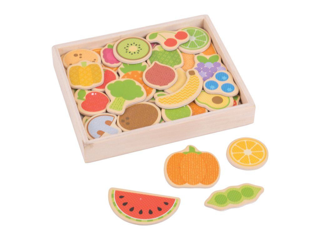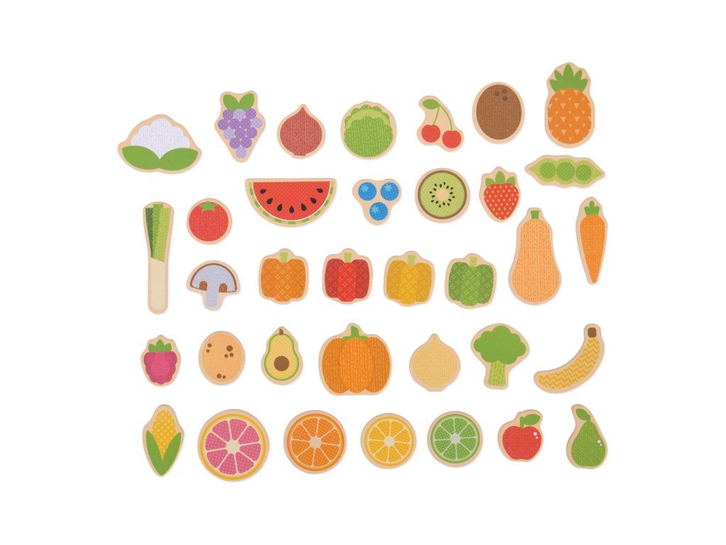 Tyto barevné magnetky jsou vyrobeny ze dřeva, zadní strana je magnetická. Podpoří děti v kreativním vyprávění vlastních příběhů. Tato sada obsahuje 35 ks magnetů – meloun, třešně, ananas, pórek, brokolici, cibuli, houby, hrozny a další! Ideální jako doplněk k magnetickým tabulím nebo jako dekorace lednice. Zabaleno v pevné dřevěné krabičce. Hračka pomáhá s rozvojem zručnosti a soustředění. Vyrobeno z kvalitních materiálů z odpovědných zdrojů. Odpovídá evropským bezpečnostním standardům. Hlavní vlastnosti: lze využít k magnetickým tabulím nebo vykouzlí zajímavé obrázky na lednicibaleno v dřevěné krabičcepomáhají rozvíjet obratnost a koncentracivyrobeno z vysoce kvalitních materiálůodpovídá současným evropským bezpečnostním normámDoplňkové parametry