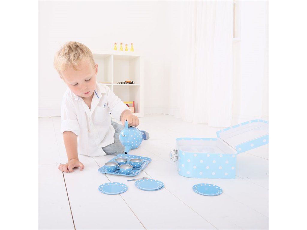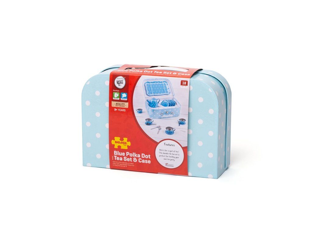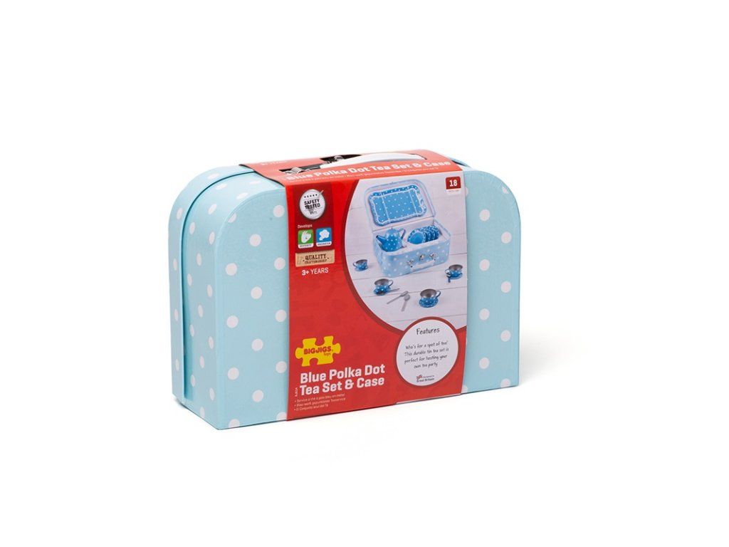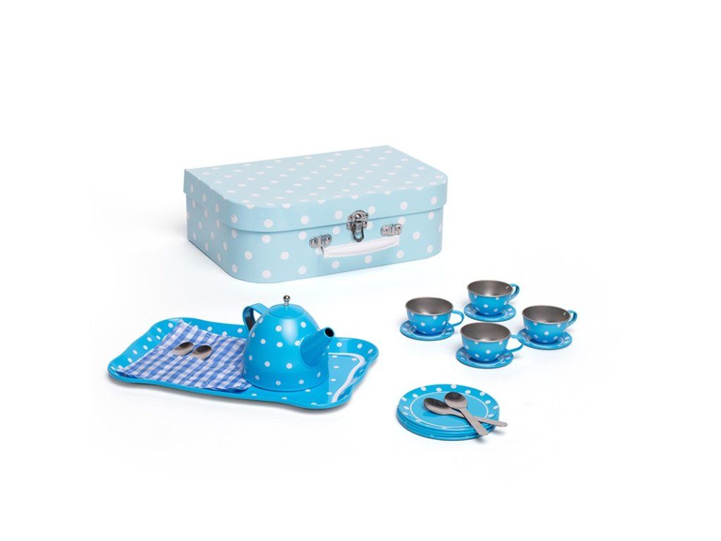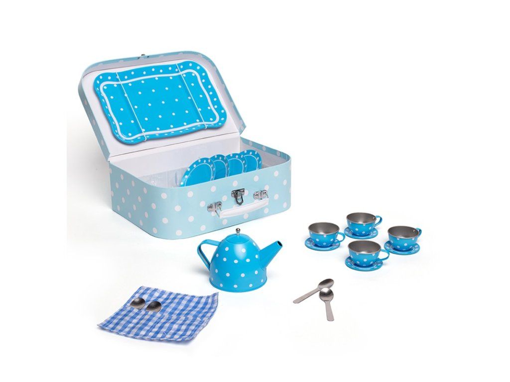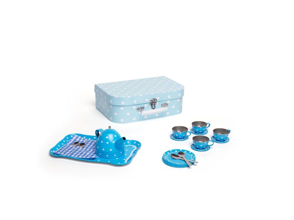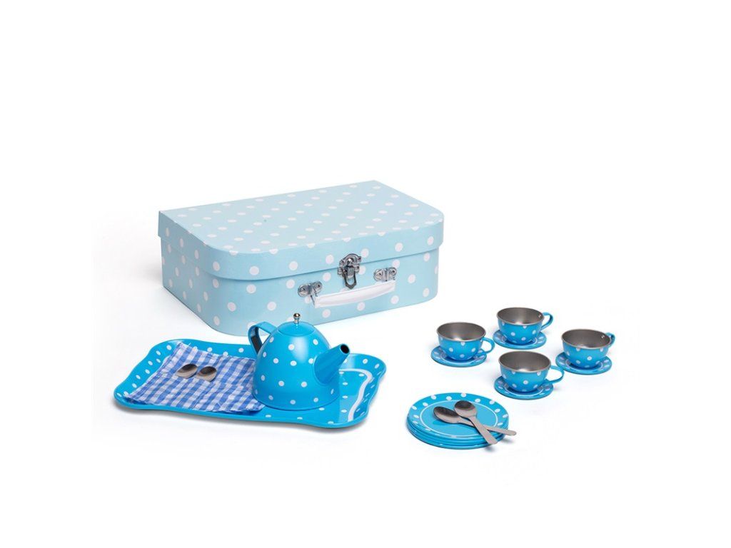 Tato nádherná puntíkovaná čajová souprava obsahuje kartonový kufřík, ve kterém najdete čtyři kovové šálky a podšálky, čajovou konvici a lžičky, talířky a servírovací tác. Sada obsahuje vše, co děti potřebují k čajovému dýchánku. Hlavní vlastnosti: vhodné i na cestyskvělý způsob, jak povzbudit kreativitu a nápadyodpovídá současným evropským bezpečnostním normámDoplňkové parametry