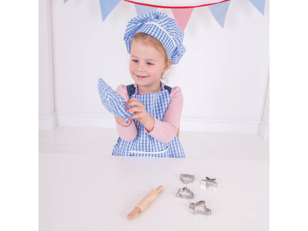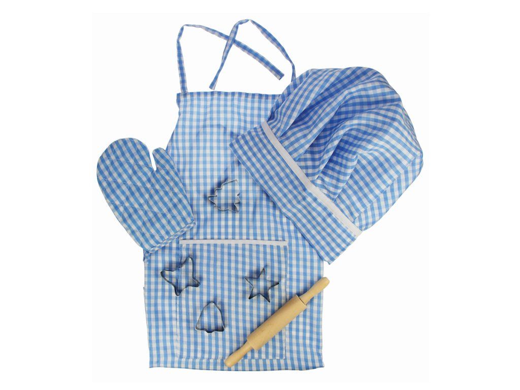 Mladí kuchaři budou milovat tuto světlou a příjemně modrou bavlněnou sadu k pečení nebo vaření, která obsahuje zástěru, chňapku, kuchařskou čepici, váleček a vykrajovátka. Ideální pro použití v asistovaném vaření nebo pečení, nebo pro použití v našem dřevěném kuchyňském sortimentu, jako součást hracích rolí, které si vaše dítě jistě rádo ztvární. K dispozici také v růžové barvě zde. Hlavní vlastnosti: čepice: zapínání na suchý zips, obvod cca 47-51 cmrukavice - délka 17 cmzástěrka - délka: bez šňůrek 56 cm + šňůrky 29cm, šířka 46 cm + každá šňůrka 42 cmDoplňkové parametry