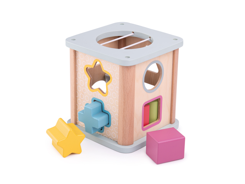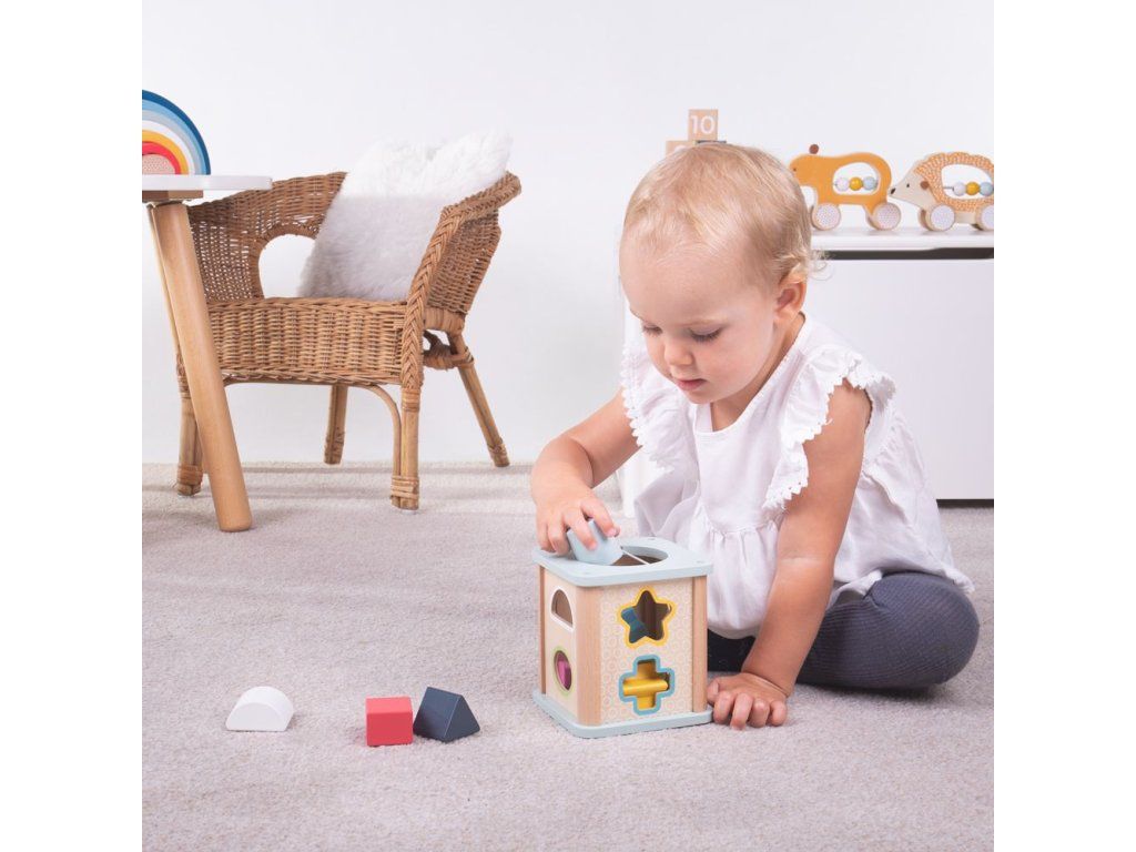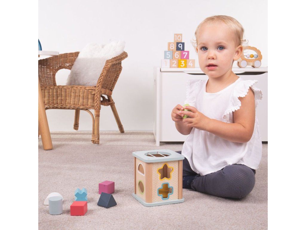 Děti budou touto vkládačkou ze 100% FSC dřeva přímo unešené! Vložte barevné kostky do správných otvorů a dívejte se jak padají doprostřed. Kostky lze vytáhnout velmi jednoduše – velkým vrchním otvorem. Jsou přes něj natáhnuty 2 gumičky, aby dílky jen tak nevypadly. Vkládání dílků procvičuje zručnost dětí a také koordinaci ruka-oko. Pastelové barvy a přírodní dřevo – vhodné pro chlapce i děvčata.Vyrobeno z FSC certifikovaných materiálů tím nejetičtějším způsobem. Kvalitní dřevo značí, že vám hračka vydrží mnoho let. Odpovídá evropským bezpečnostním standardům. Hlavní vlastnosti: 9 dílkůrozvíjí zručnost a koordinaci ruka-okovyrobeno ze 100% FSC certifikovaného dřevalak bezpečný pro děti Značka a certifikát FSC® (Forest Stewardship Council) zaručuje, že dřevo, ze kterého byl produkt vyroben, nebylo vytěženo nelegálně a pochází z lesů obhospodařovaných šetrným či přírodě blízkým způsobem, ve kterém jsou dodržovány přísné environmentální a sociální požadavky. Značka FSC® na výrobku znamená, že svým nákupem pomáháte chránit lesy a podporujete šetrné, odpovědné či přírodě blízké hospodaření, díky kterému jsou naše lesy stabilnější, zdravější, mají přirozenou druhovou skladbu a lépe odolávají negativním následkům klimatických změn.Doplňkové parametry
