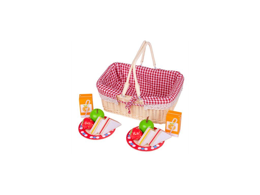 Tradiční piknikový košík naplněný vším potřebným. Obsahuje dřevěné sendviče, jahody, jablka a pomerančová fruika. Proutěný košík také obsahuje talířky a deku na piknik. Děti tak mohou piknikovat se svými plyšáky nebo vyrazit do parku s rodinou a přáteli. Perfektní hračka pro interaktivní hru. Učí děti o důležitosti zdravé a vyvážené stravy. Podporuje je v kreativním a představivém hraní na role. Vyrobeno z kvalitních materiálů z odpovědných zdrojů. Odpovídá evropské bezpečnostní normě. Hlavní vlastnosti: košík se všemi náležitostmi k piknikuvhodné pro interaktivní hrupodporuje kreativitu a představivé myšleníDoplňkové parametry