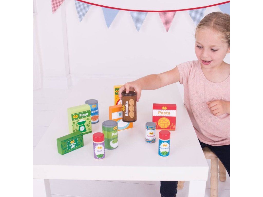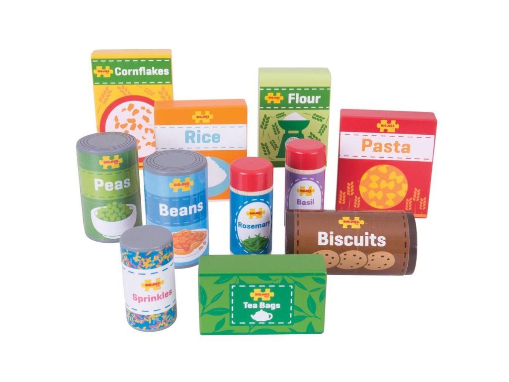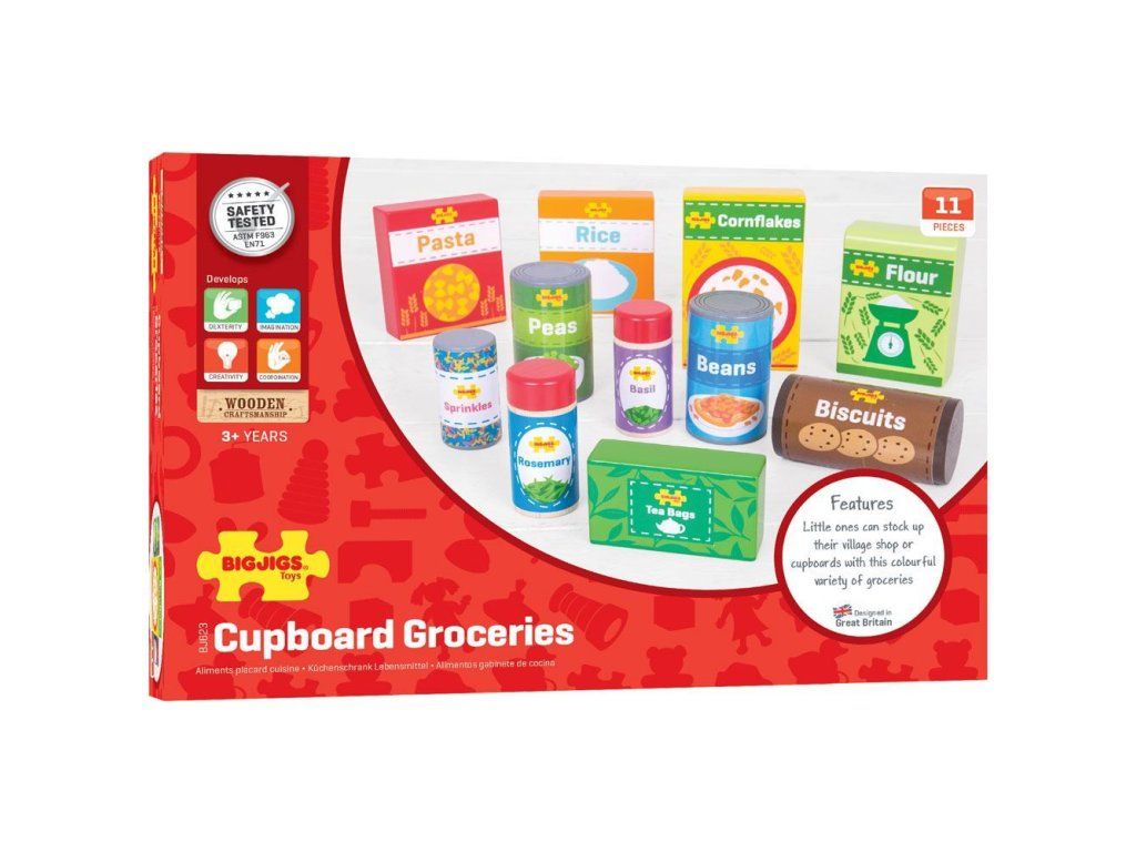 Oživte kuchyňku nebo obchůdek s touto dřevěnou sadou potravin. Sada obsahuje 11 ks základních trvanlivých potravin včetně těstovin, rýže, kukuřičných lupínků, sušenek, čaje, konzervy fazolí a dalších. Zlepšuje koordinaci dětí a inspiruje k hraní v různých rolích. BigJigs je velký fanoušek zdravé výživy a jaká by byla lepší cesta učit děti o zdravé výživě, než pomocí hraček z našeho sortimentu? Dřevěné hrací jídlo je ideální k tomu, aby se vaše dítě dozvědělo o důležitosti zdravé a vyvážené stravy. A také o tom, odkud naše jídlo pochází a jak ho připravujeme. Hlavní vlastnosti: podporuje kreativní a nápadité hranívyrobeno z vysoce kvalitních, zodpovědně dodávaných materiálůodpovídá současným evropským bezpečnostním normámDoplňkové parametry