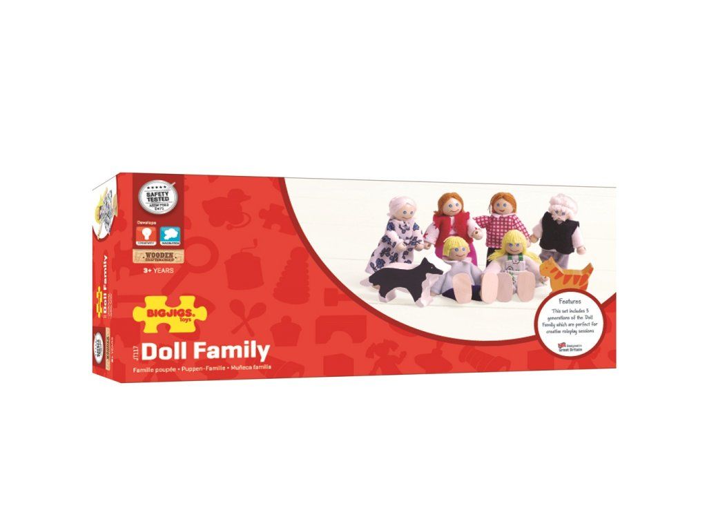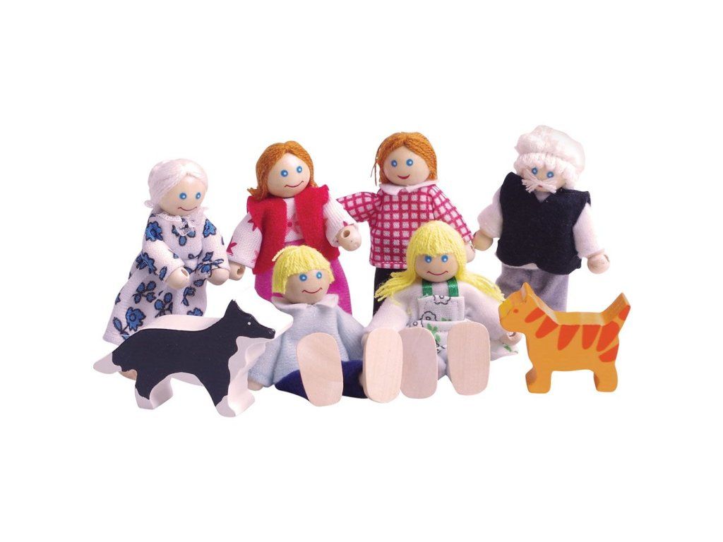 Tady jsou tři generace jedné milující dřevěné rodiny - prarodiče, máma, táta, jejich dvě děti a jejich mazlíčci - kočka a pes. Mají spoustu příběhů k vyprávění a čeká je spousta dalších dobrodružství. Ideální velikost, aby se vešly do řady dřevěných domečků Bigjigs Toys. Hlavní vlastnosti: 8 hracích figurek vyrobeno z vysoce kvalitních materiálů vyhovuje současným evropským bezpečnostním normámDoplňkové parametry
