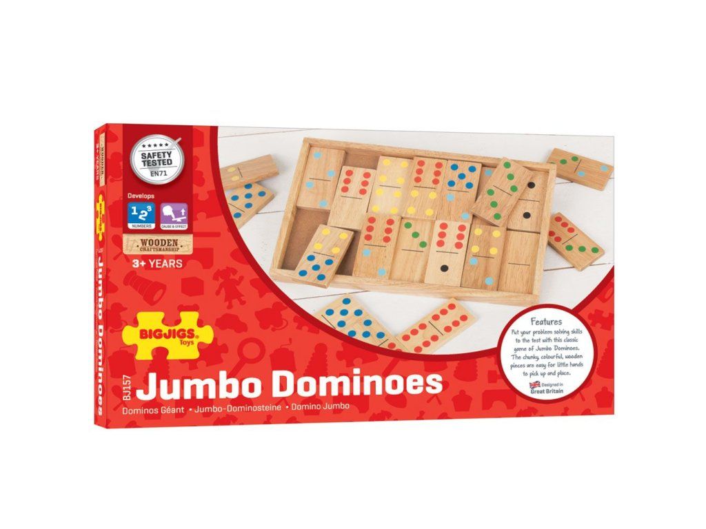 Tohle pestrobarevné dřevěné domino Jumbo, je perfektně dimenzováno pro malé ručičky, kterým se tak dílky snadno zvedají a umisťují. Hra pomáhá rozvíjet obratnost, dovednosti v souhře a koncentraci. Hrací dílky lze po ukončení hry uložit do dřevěné krabice s posuvným víkem. Hlavní vlastnosti: vyrobeno z vysoce kvalitních materiálůvyhovuje současným evropským bezpečnostním normámobsahuje 28 hracích dílkůDoplňkové parametry