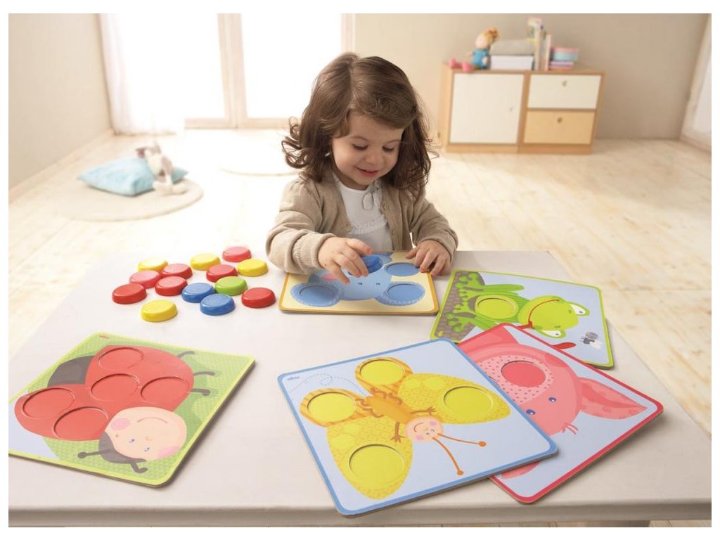 Vyhledávání, třídění a vkládání kroužků podle barev pro děti od 2 let.