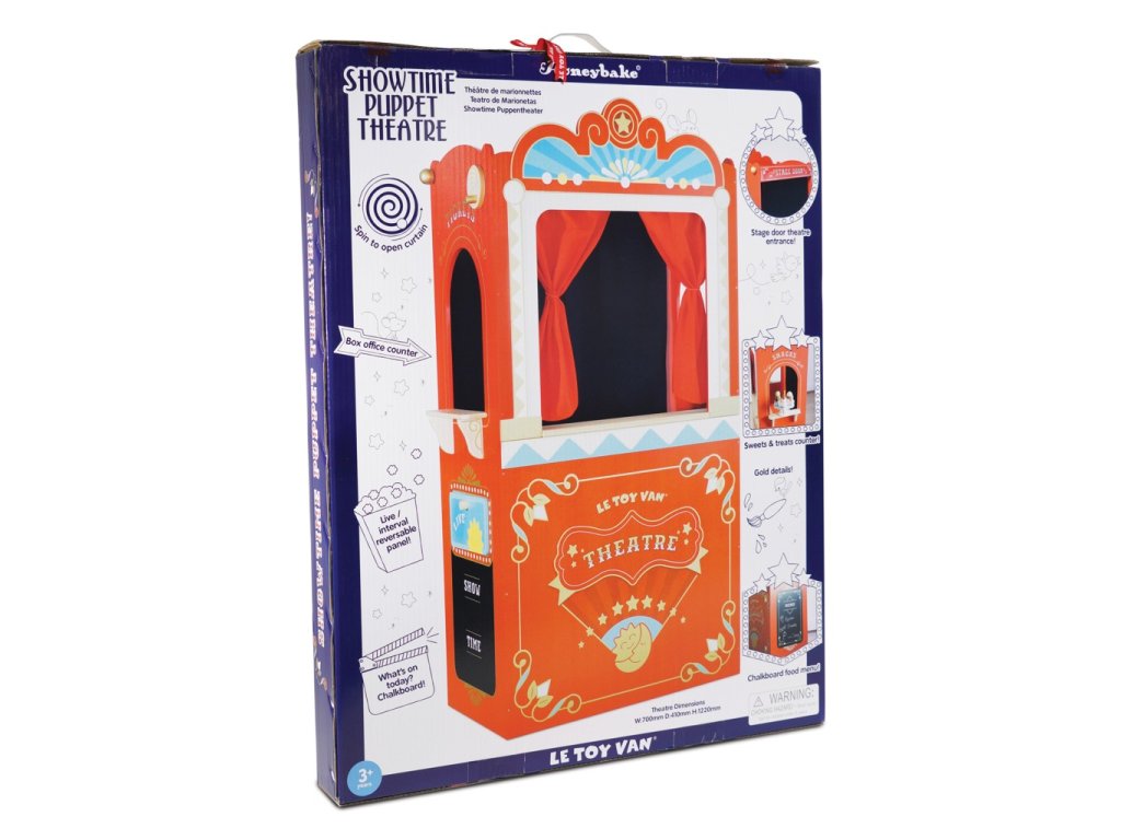 Jeviště je připraveno! Toto krásné retro divadlo má unikátní design a pestrobarevný zevnějšek. Je také vyrobeno z odolného a udržitelného dřeva. Malí herci a herečky si tuto interaktivní hračku jistě zamilují, je realistická a inspiruje k představivé hře. V balení najdete oboustrannou cedulku, dveře na jeviště, dvě tabulky na křídu, na které můžete napsat divadelní program. Pro dramatický efekt byla přidána červená opona a černá zástěna.Divadlo má tři okénka – jeviště, bufet a pokladnu. Děti si s touto hračkou užijí mnoho představivé zábavy. K divadlu se perfektně hodí také popkornovač od Le Toy Van. Hlavní vlastnosti: interaktivní maňáskové divadlotestováno dle nejpřísnějších standardůvyrobeno z udržitelného a odolného dřeva, bez obsahu plastumalováno netoxickými barvami na bázi vodygenderově neutrální designinspiruje ke kreativní a představivé hřepodporuje při raném vývoji Honeybake kolekce: Hračky v této kolekci jsou vhodné k objevování, pomohou dětem s rozvojem představivosti, sociálních a verbálních dovedností a kognitivních funkcí. Tradiční design s moderními detaily děti jistě bude bavit. Honeybake je kolekce Le Toy Van, která vyhrála nejvíce ocenění, a to za design, kvalitu, bezpečnost a také za vzdělávací a herní hodnotu.Doplňkové parametry