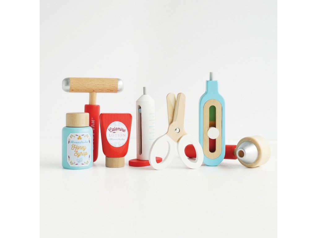 Poškozený obal. Nové zboží bez závad. Je tu někde lékař?! Doktorská brašna ve vintage stylu, plná dřevěných lékařských nástrojů a lahviček. Pro děti od 3 let. V balení naleznete stetoskop, teploměr, stříkačku, tlakoměr, otoskop, reflexní neurologické poklepové kladívko, nůžky a dvě lahvičky s léky. Hlavní vlastnosti: Lékařská brašna pro děti s mnoha doplňky Je součástí série Honeybake od Le Toy Van Podporuje děti v hraní na role, v kreativní představivosti, vývoji jazyka a sociálních dovedností Genderově neutrální barva vybízí k sdílení hračky mezi sourozenci, kamarády Vyrobeno z odolného a šetrně zpracovaného kaučuku, dlouhotrvající zábava a starost o planetu jdou ruku v ruce Bezpečná hračka malována netoxickými barvami a testována dle nejvyšších bezpečnostních standard Pěkná hračka pro děti od 3 let, perfektní na doma i výlety Ocenění hračky: Dr. Toys Award 2016, Slow Toy Award 2014 Junior Design Award 2014 V roce 2016 byla doporučena skupinou Experts at Fundamentally Children. Britská značka Le Toy Van výrábí tradiční, vysoce kvalitní, prémiové dřevěné hračky v moderním designu. Kvalitu hraček zajišťuje pečlivý výběr přírodních materiálů a výjimečné detailní zpracování. Le Toy Van hračky jsou ručně malované. Inspirována dětskou představivostí je společnost Le Toy Van hrdá na to, že navrhuje inovativní hračky, které podporují plnohodnotný rozvoj dětí. Společnost Le Toy Van byla založena v roce 1995 v anglickém Surrey, jako rodinná firma. Zakladaleli byli Georges Le Van a jeho syn Steven Le Van, kteři jsou pokračovateli rodinné společnosti s více než 150 letou historií a zkušenostmi v ruční výrobě dřevěných hraček. Během posledních 25 let se společnost Le Toy Van stala důvěryhodným výrobcem dřevěných hraček. Oceněné hračky se nyní prodávají ve více než 50 zemích světa. Všechny hračky splňují nejpřísnější bezpečnostní normy ICTI, ISO 9001, EN-71 a ASTM.Doplňkové parametry