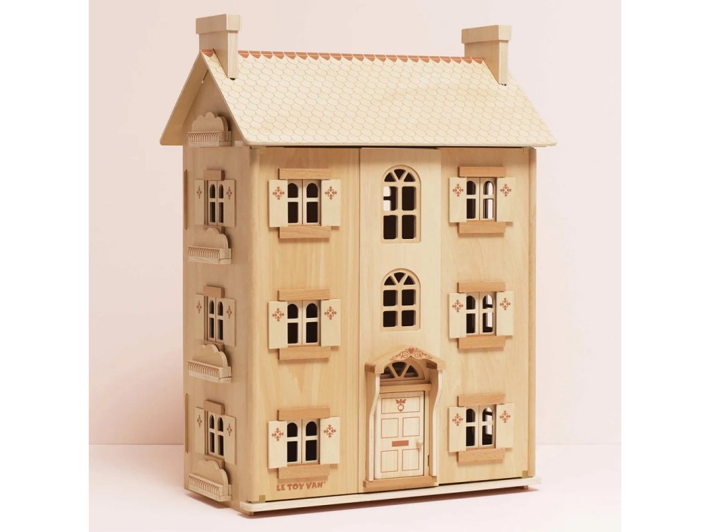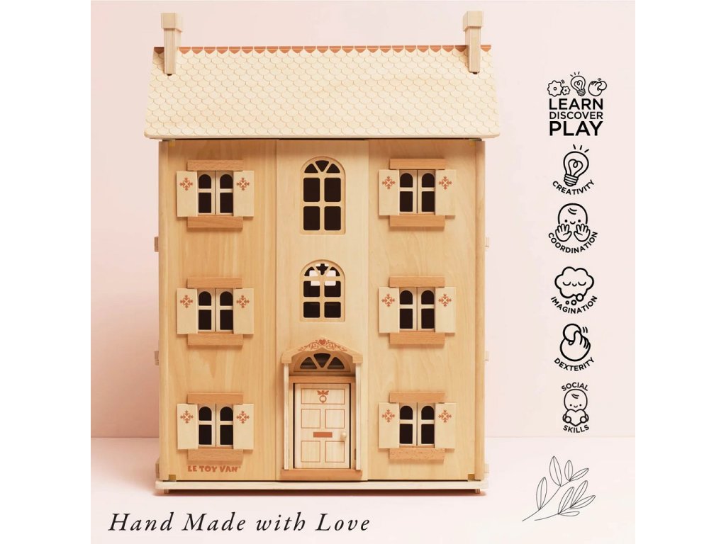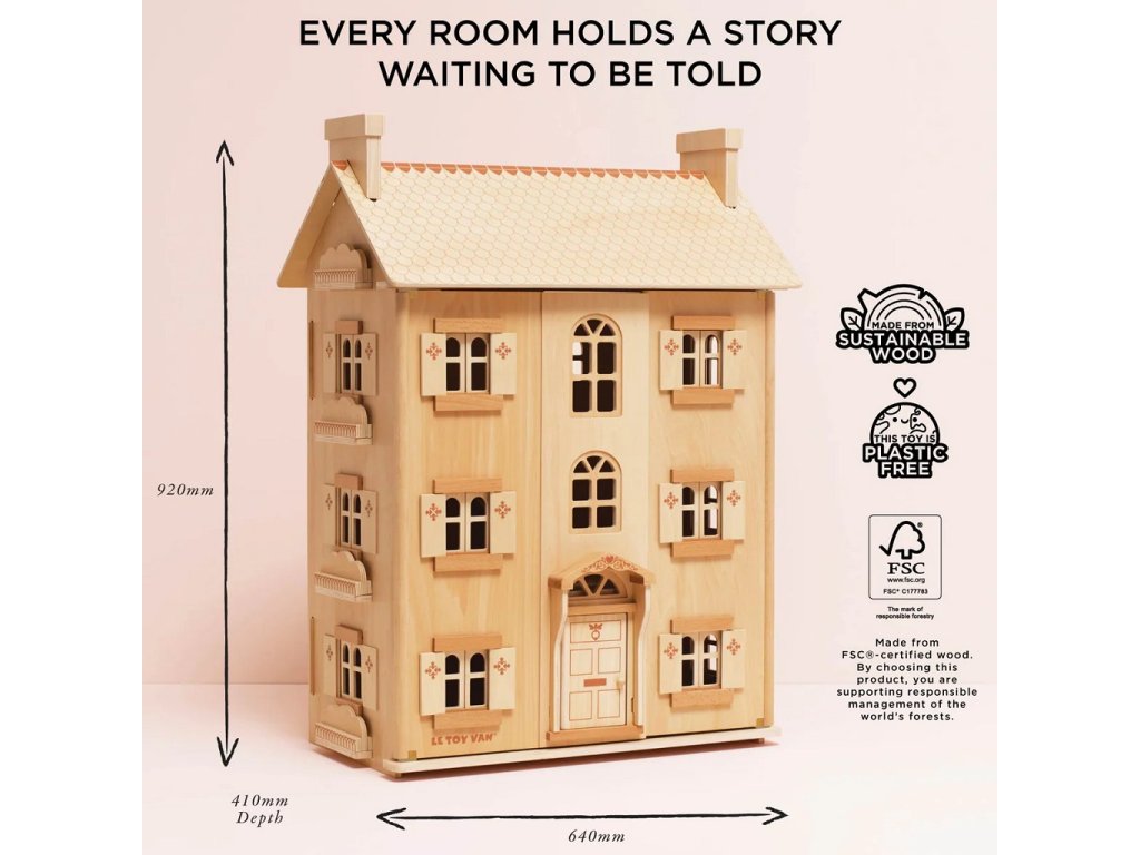 Tento nádherný domeček z přírodního dřeva oslavuje 30 let vynikajícího designu domečků firmy Le Toy Van. S tímto domečkem uvedete děti do magického světa představivosti. Vysoký domeček se čtyřmi patry byl vyroben eticky s láskou, ze dřeva z udržitelných zdrojů s certifikací FSC. Krásně detailní domeček má otevírací a zavírací okna, okenice i dveře. Tato hračka u děti rozvíjí klíčové dovednosti formou hry. Od kreativity, řeči až po koordinaci ruka- oko. Výjimečná hračka plná radosti a nostalgie, s kterou si děti užijí mnoho let magické hry. Domeček si můžete předávat z generace na generaci. Všechny domy pro panenky od Le Toy Van byly navrženy týmem z Velké Británie, vyrobeny byly za užití etických praktik a udržitelných materiálů. Domeček můžete dovybavit dřevěným nábytkem, panenkami a jinými doplňky. Hračky s účelemVšechny hračky firmy Le Toy Van jsou vyrobeny s cílem – aby dlouho vydržely. Designovány s láskou zkušenými řemeslníky za použití etických praktik a udržitelných materiálů, které jsou laskavější k naší planetě. Hlavní vlastnosti: vyrobeno eticky z udržitelného FSC dřevatestováno dle nejpřísnějších standardůnábytek a panenky nejsou součástí baleníinspiruje k představivé a dlouhotrvající hřeasistuje v rozvoji koordinace ruka-okogenderově neutrální designhračka bez plastu Značka a certifikát FSC® (Forest Stewardship Council) zaručuje, že dřevo, ze kterého byl produkt vyroben, nebylo vytěženo nelegálně a pochází z lesů obhospodařovaných šetrným či přírodě blízkým způsobem, ve kterém jsou dodržovány přísné environmentální a sociální požadavky. Značka FSC® na výrobku znamená, že svým nákupem pomáháte chránit lesy a podporujete šetrné, odpovědné či přírodě blízké hospodaření, díky kterému jsou naše lesy stabilnější, zdravější, mají přirozenou druhovou skladbu a lépe odolávají negativním následkům klimatických změn.Doplňkové parametry