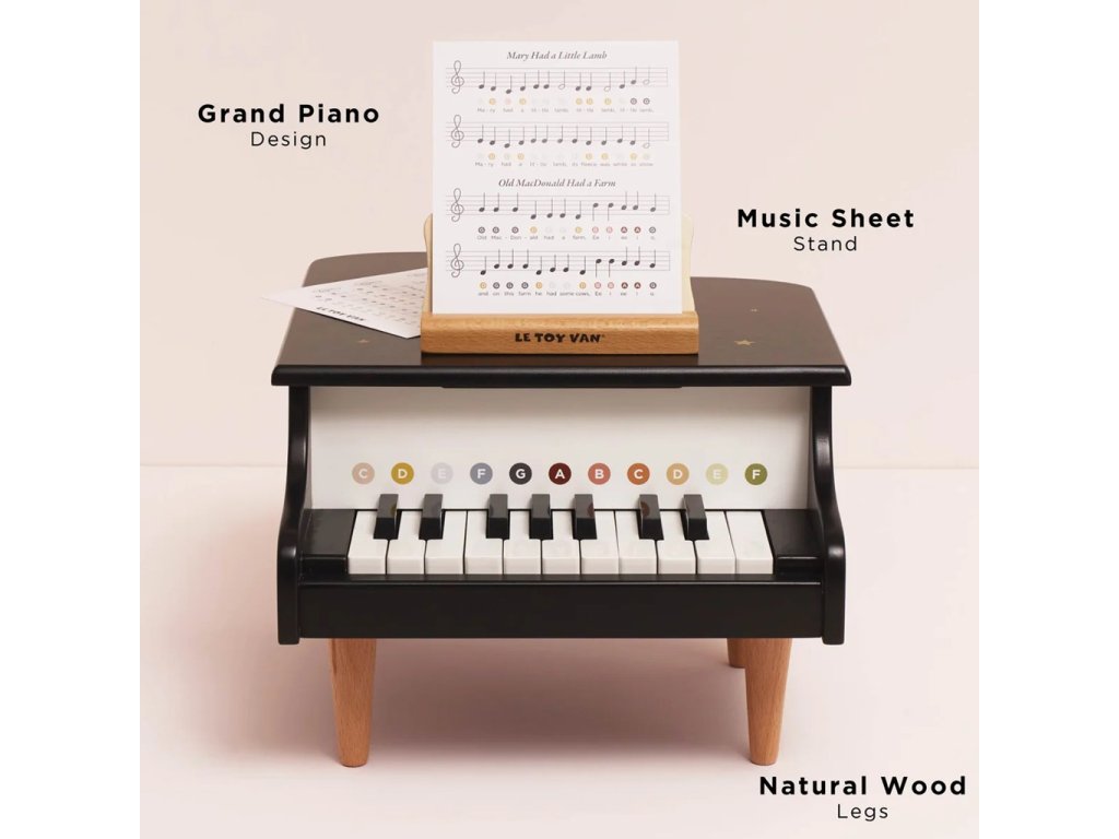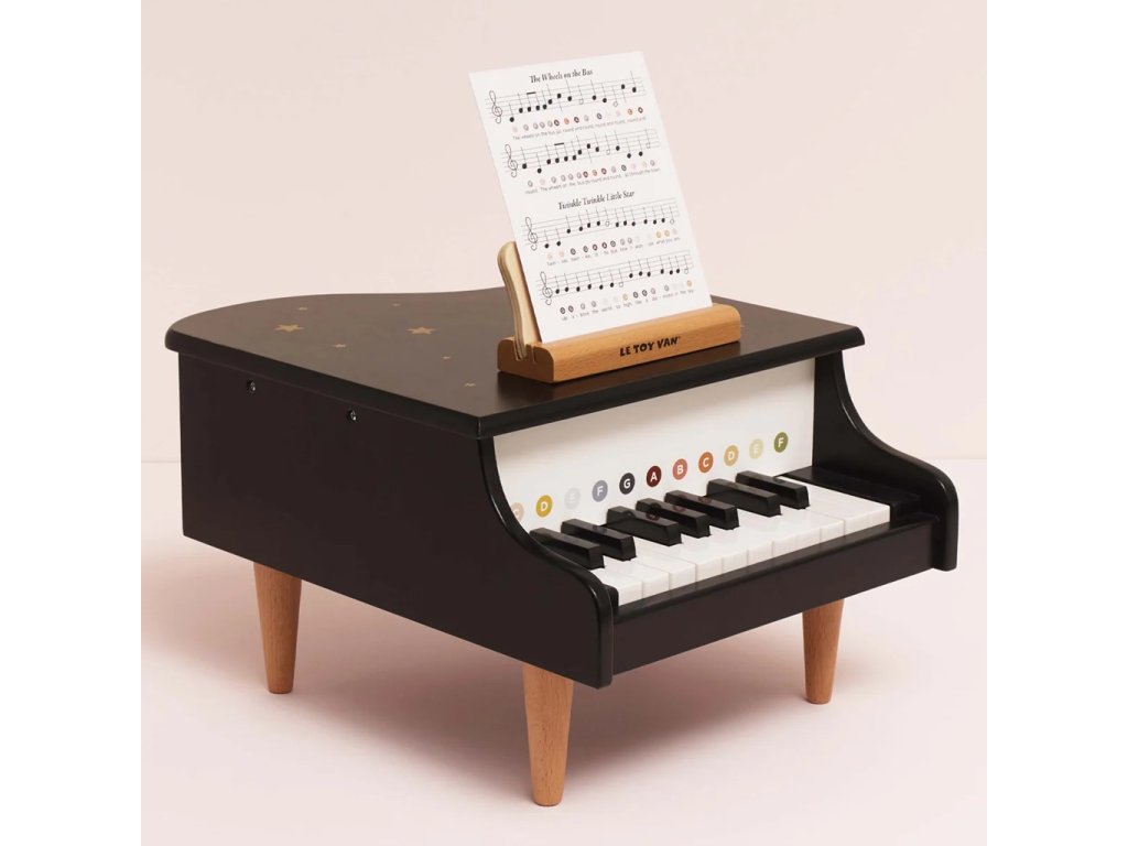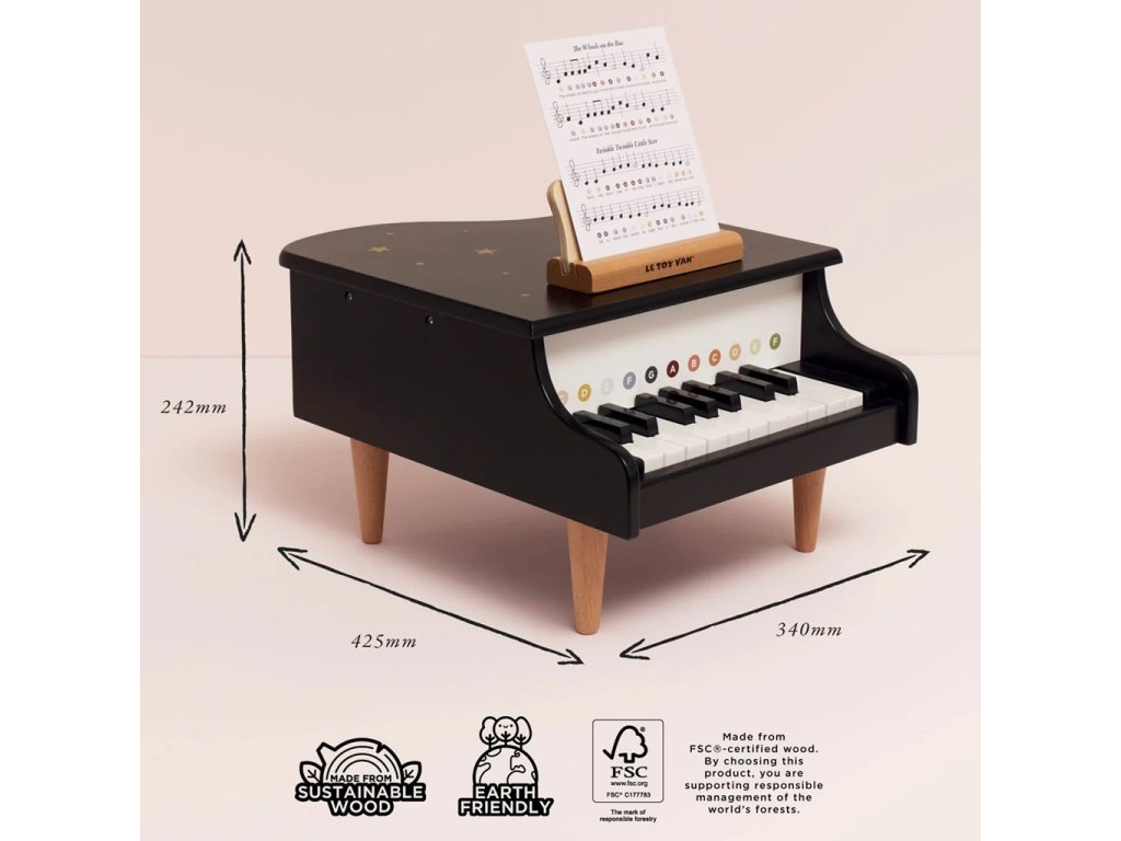 Probuďte v dětech lásku k hudbě s tímto krásně zpracovaným dřevěným klavírem z certifikovaného FSC® dřeva, navrženým speciálně pro začínající hudebníky. Tento okouzlující nástroj, vyrobený z udržitelného materiálu a opatřený elegantním černým lakem s jemnými zlatými hvězdami, vnáší do hry styl i prostor pro tvořivost. Robustní dřevěné nožky zajišťují stabilitu a odolnost, díky čemuž je klavír připraven na dlouhé hodiny hraní. Součástí balení jsou dva oboustranné notové zápisy s osmi oblíbenými dětskými říkankami v angličtině, které pomáhají rozvíjet základní hudební dovednosti hravou formou. Dřevěný stojánek bezpečně udrží noty na místě, což usnadňuje hru i těm nejmenším prstíkům. Tento nadčasový kousek je nejen krásnou hračkou, ale i hodnotnou vzpomínkou, která může dětem připomínat první krůčky do světa hudby po mnoho let. Vydává krásné zvuky a rozvíjí vztah k hudbě, ale není to profesionální hudební nástroj. Hračka není dokonale naladěná, slouží především k zábavě. Hračky s účelemVšechny hračky firmy Le Toy Van jsou vyrobeny s cílem – aby dlouho vydržely. Designovány s láskou zkušenými řemeslníky za použití etických praktik a udržitelných materiálů, které jsou laskavější k naší planetě. Hlavní vlastnosti: vyrobeno eticky z udržitelného dřevatestováno dle nejpřísnějších standardůmalováno netoxickými barvami na bázi vodyrozvíjí talent dětí, cit pro rytmus a melodiiDoplňkové parametry