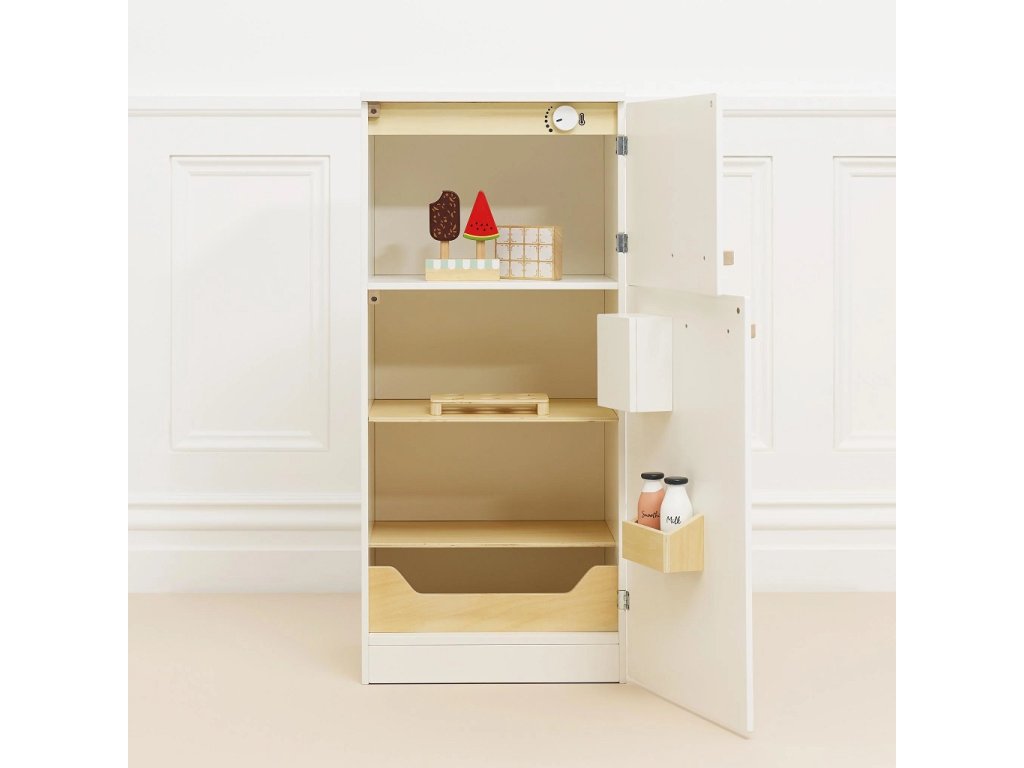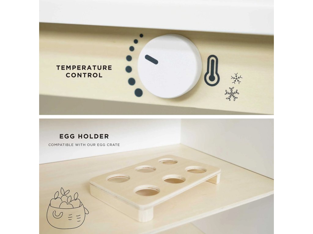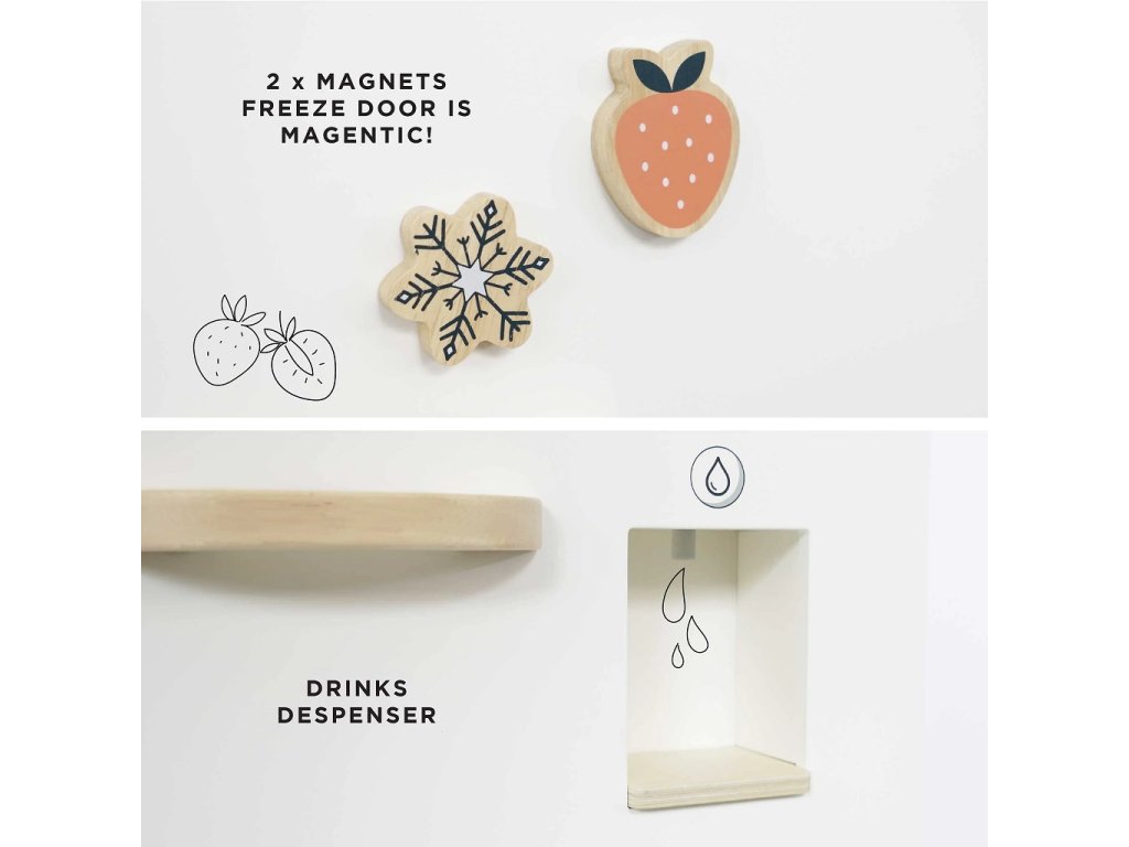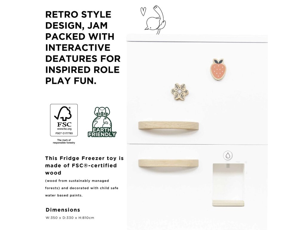Vylepšete svou kuchyňku touto úžasnou volně stojící lednicí s mrazákem! Odolná hračka s lákavým retro designem je plná interaktivních funkcí pro větší zábavu a víc nápadité hraní rolí. Objevte vestavěný dávkovač vody, ovládání teploty či přihrádky na ovoce a zeleninu. Kompletní set přichází také s řadou příslušenství včetně 2 nanuků, stojanu, tácků na vejce a led a láhve na mléko či smoothie. Dveře ledničky jsou magnetické a navíc jsou zde dva praktické, zdobné magnety. Lednice je kompatibilní s velkou kuchyní Le Toy Van (kód TV347). Sada je vyrobena ze dřeva s certifikací FSC® (dřevo z lesů obhospodařovaných udržitelným způsobem) a zdobena barvami na vodní bázi bezpečnými pro děti. Hračky s účelemVšechny hračky firmy Le Toy Van jsou vyrobeny s cílem – aby dlouho vydržely. Designovány s láskou zkušenými řemeslníky za použití etických praktik a udržitelných materiálů, které jsou laskavější k naší planetě. Hlavní vlastnosti: vyrobeno eticky z FSC udržitelného dřevamalováno netoxickými barvami na bázi vodytestováno dle nejpřísnějších standardůobsahuje lednici s mrazákem, 2 magnety, tác na ledové kostky, tác na vejce, 2 nanuky, 2 láhve, dávkovač vodyinspiruje k nápadité hře Značka a certifikát FSC® (Forest Stewardship Council) zaručuje, že dřevo, ze kterého byl produkt vyroben, nebylo vytěženo nelegálně a pochází z lesů obhospodařovaných šetrným či přírodě blízkým způsobem, ve kterém jsou dodržovány přísné environmentální a sociální požadavky. Značka FSC® na výrobku znamená, že svým nákupem pomáháte chránit lesy a podporujete šetrné, odpovědné či přírodě blízké hospodaření, díky kterému jsou naše lesy stabilnější, zdravější, mají přirozenou druhovou skladbu a lépe odolávají negativním následkům klimatických změn.Doplňkové parametry