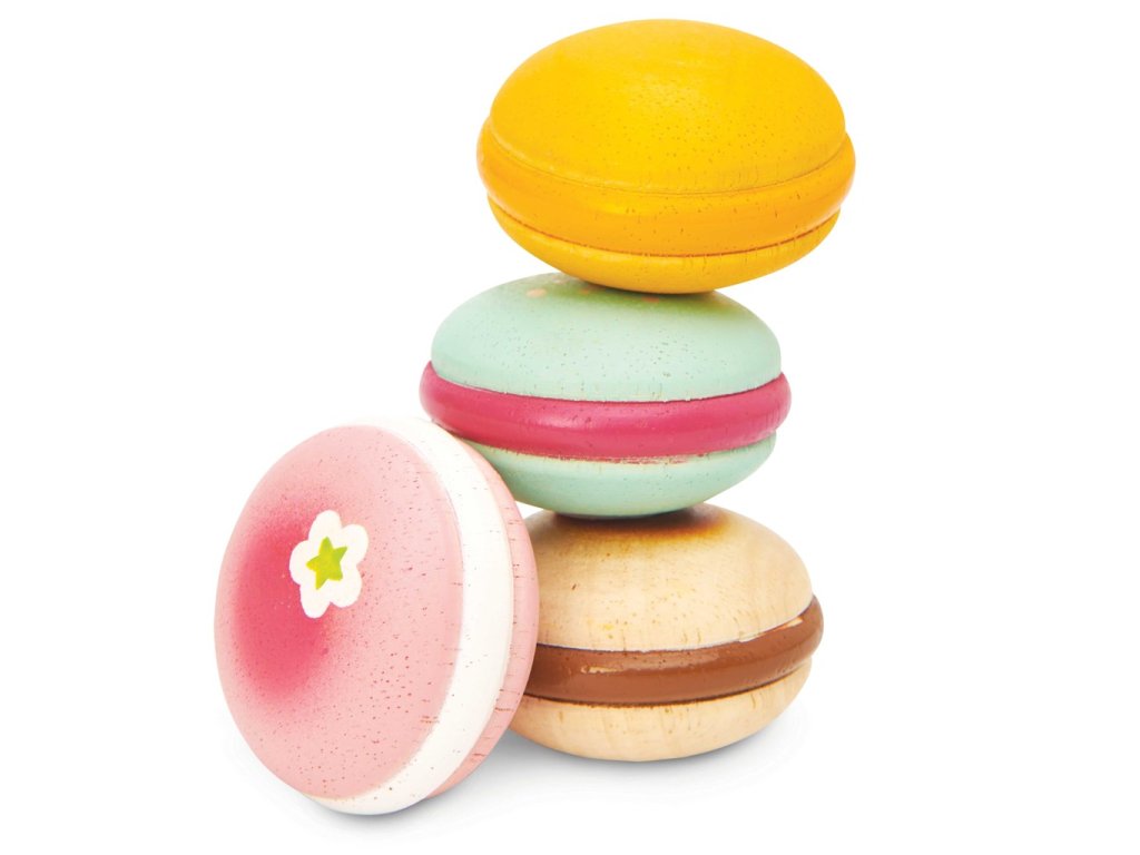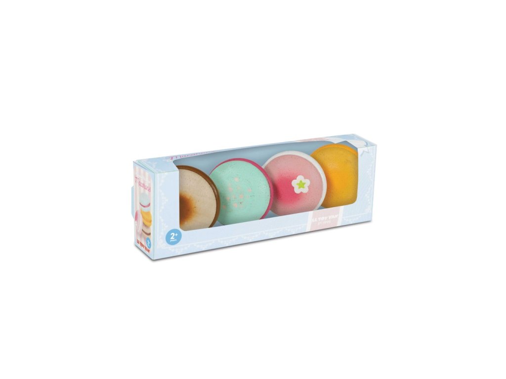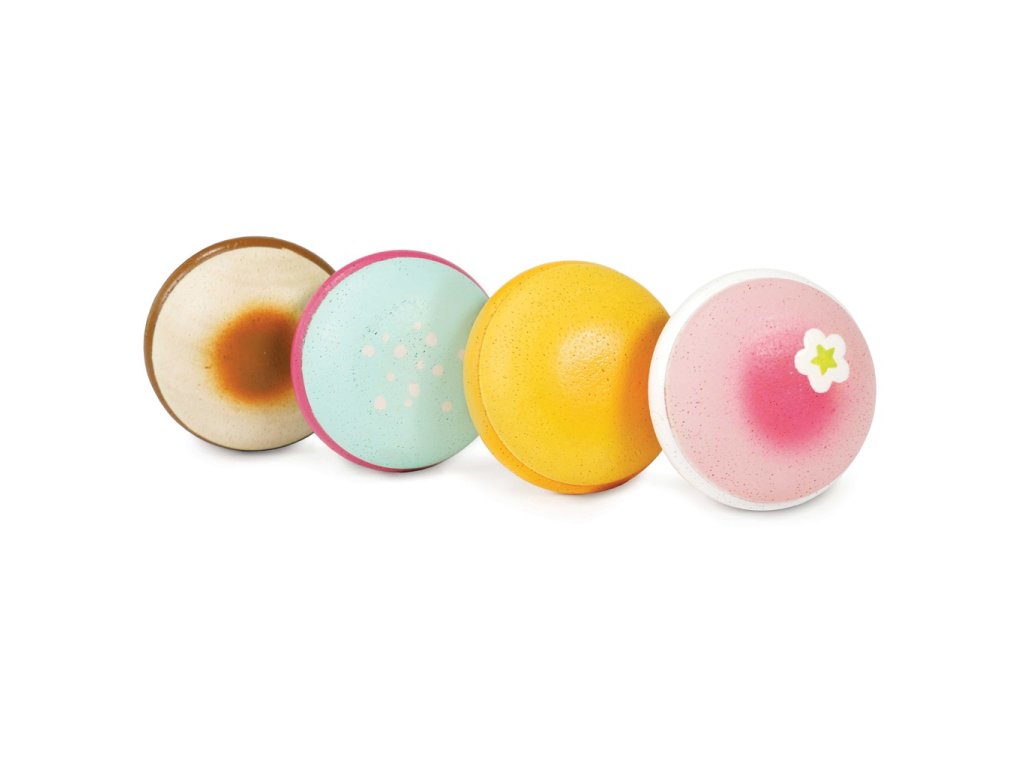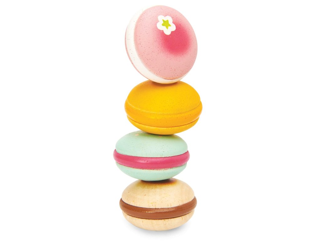 Ideální hračka pro malé mlsouny. Tato lákavá sada čtyř makronek z masivního dřeva je skvělou lahůdkou, kterou děti mohou servírovat při představivém čajovém dýchánku. Každá makronka je zdobena netoxickými pastelovými barvami na bázi vody. Baleno v krásné dárkové krabičce s okénkem. Ideální doplněk k ostatním sladkostem Le Toy Van a perfektní představivá hračka. Hračky s účelemVšechny hračky firmy Le Toy Van jsou vyrobeny s cílem – aby dlouho vydržely. Designovány s láskou zkušenými řemeslníky za použití etických praktik a udržitelných materiálů, které jsou laskavější k naší planetě. Hlavní vlastnosti: vyrobeno eticky z udržitelného dřevatestováno dle nejpřísnějších standardůmalováno netoxickými barvami na bázi vodyinspiruje k představivé hřevhodné pro hru na role Honeybake kolekce: Hračky v této kolekci jsou vhodné k objevování, pomohou dětem s rozvojem představivosti, sociálních a verbálních dovedností a kognitivních funkcí. Tradiční design s moderními detaily děti jistě bude bavit. Honeybake je kolekce Le Toy Van, která vyhrála nejvíce ocenění, a to za design, kvalitu, bezpečnost a také za vzdělávací a herní hodnotu.Doplňkové parametry